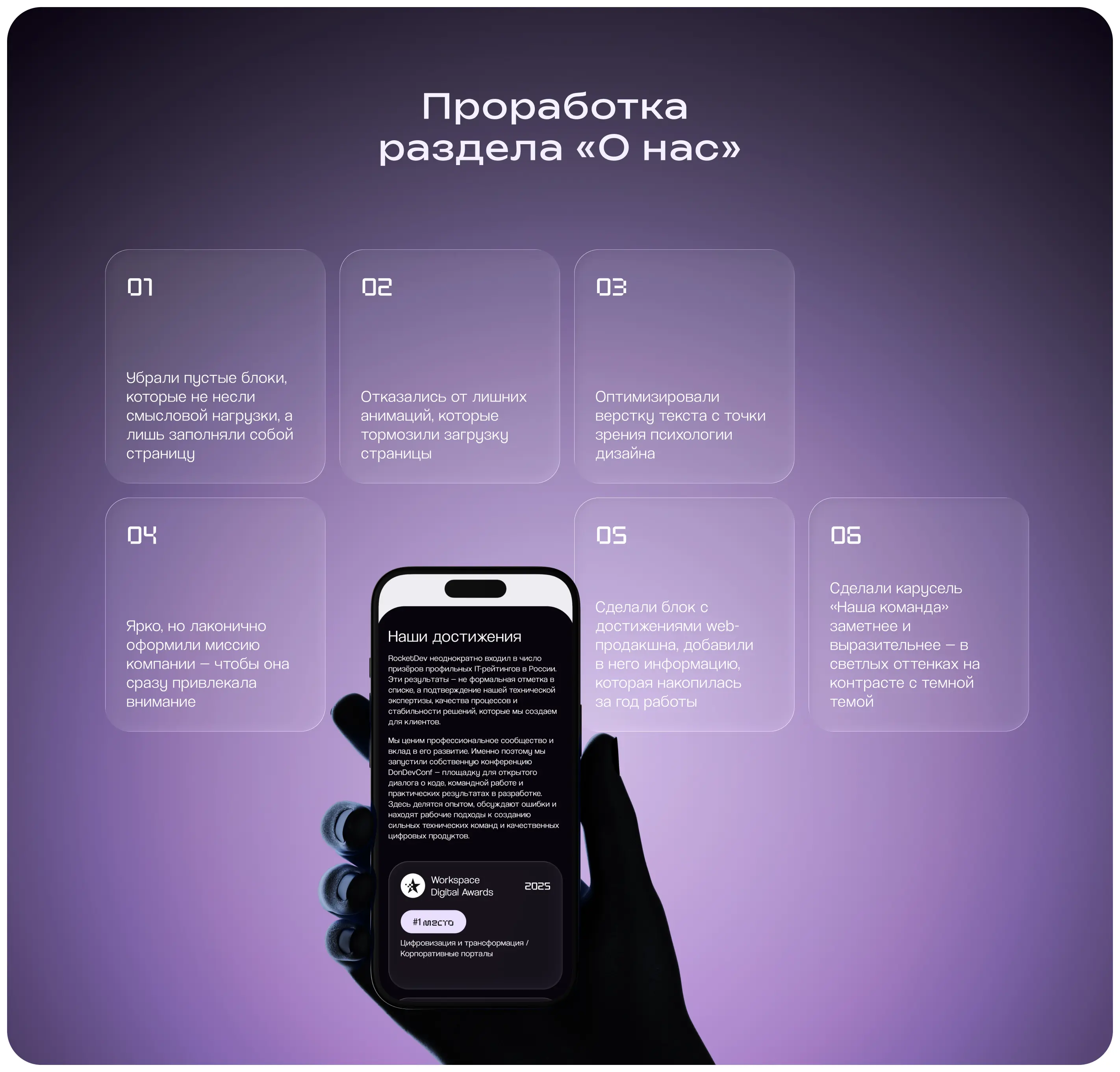 Спустя год прежняя версия раздела «О нас» казалась слишком громоздкой на фоне обновленных ресурсов конкурентов. Поэтому мы оперативно обновили ее структуру, оставив лишь самую важную информацию, которую клиенту необходимо знать о команде.