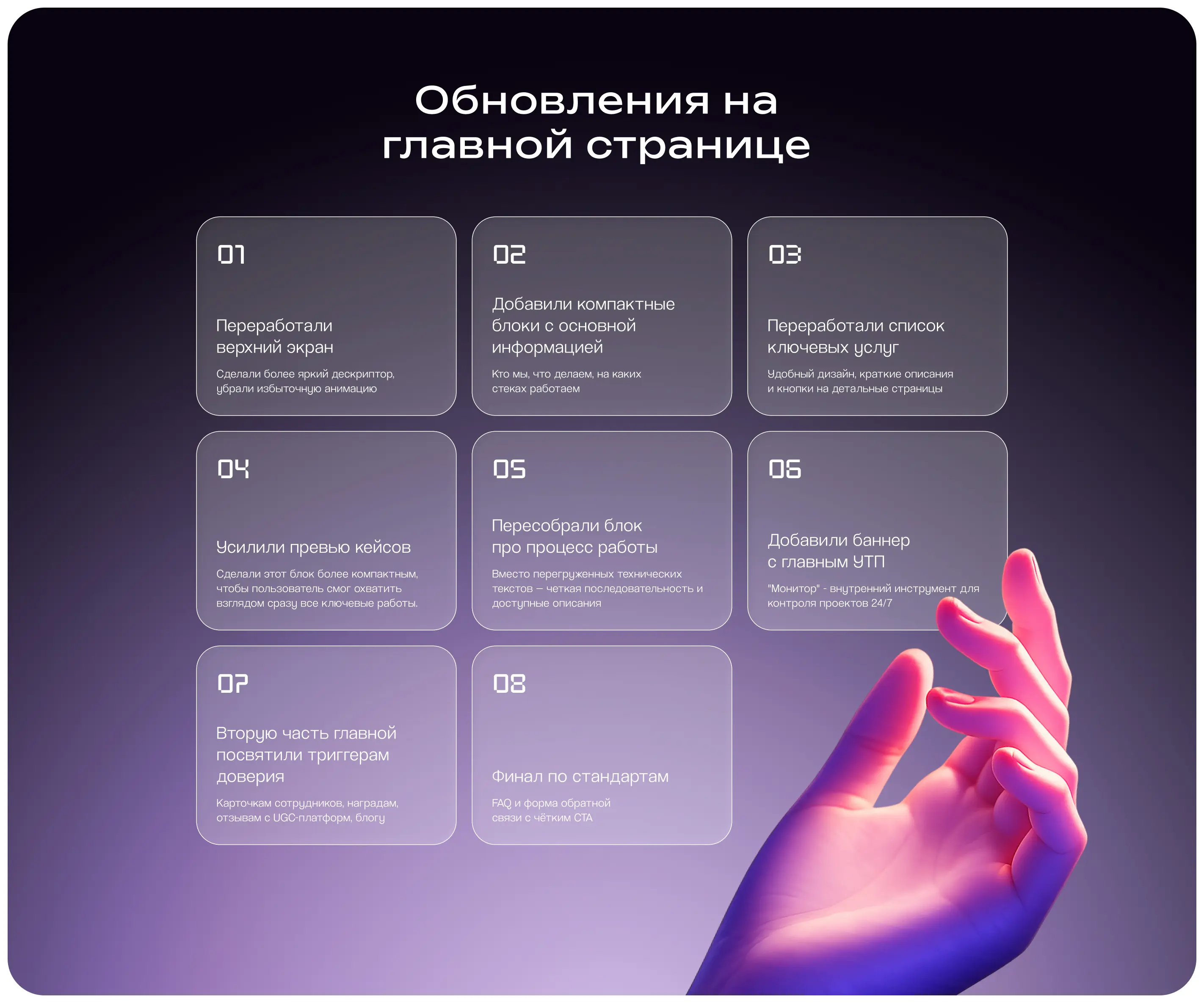 10) Масштабируемая структура без глобального редизайна. Теперь новые услуги можно быстро добавлять на сайт с минимальными правками в верстке.