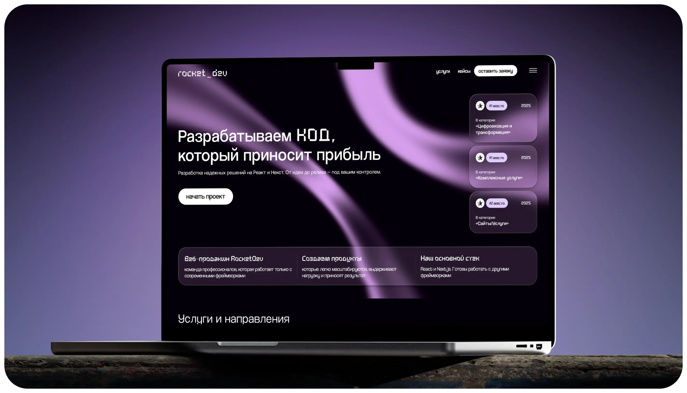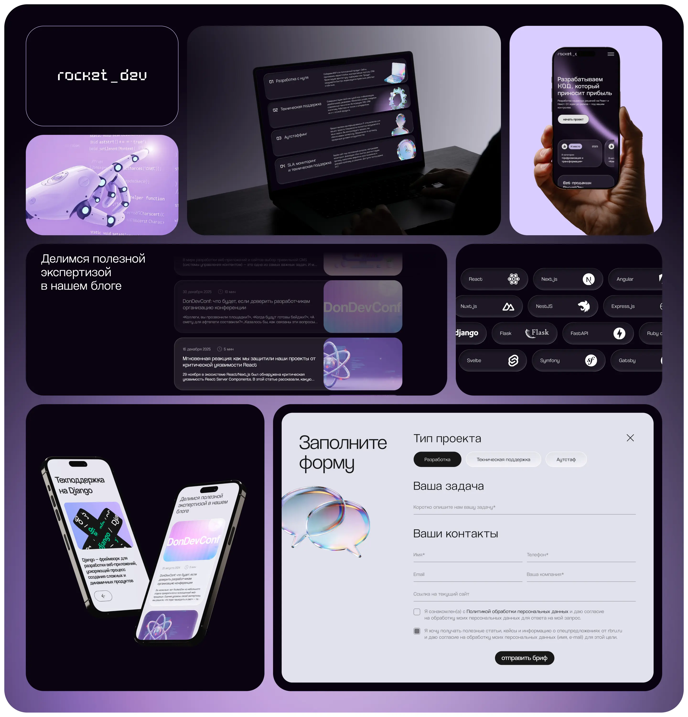 RocketDev — web-продакшн с уникальной специализацией. Команда разрабатывает ресурсы на React и Next.js, работает со сложными и нестандартными проектами, проводит профильные мероприятия.