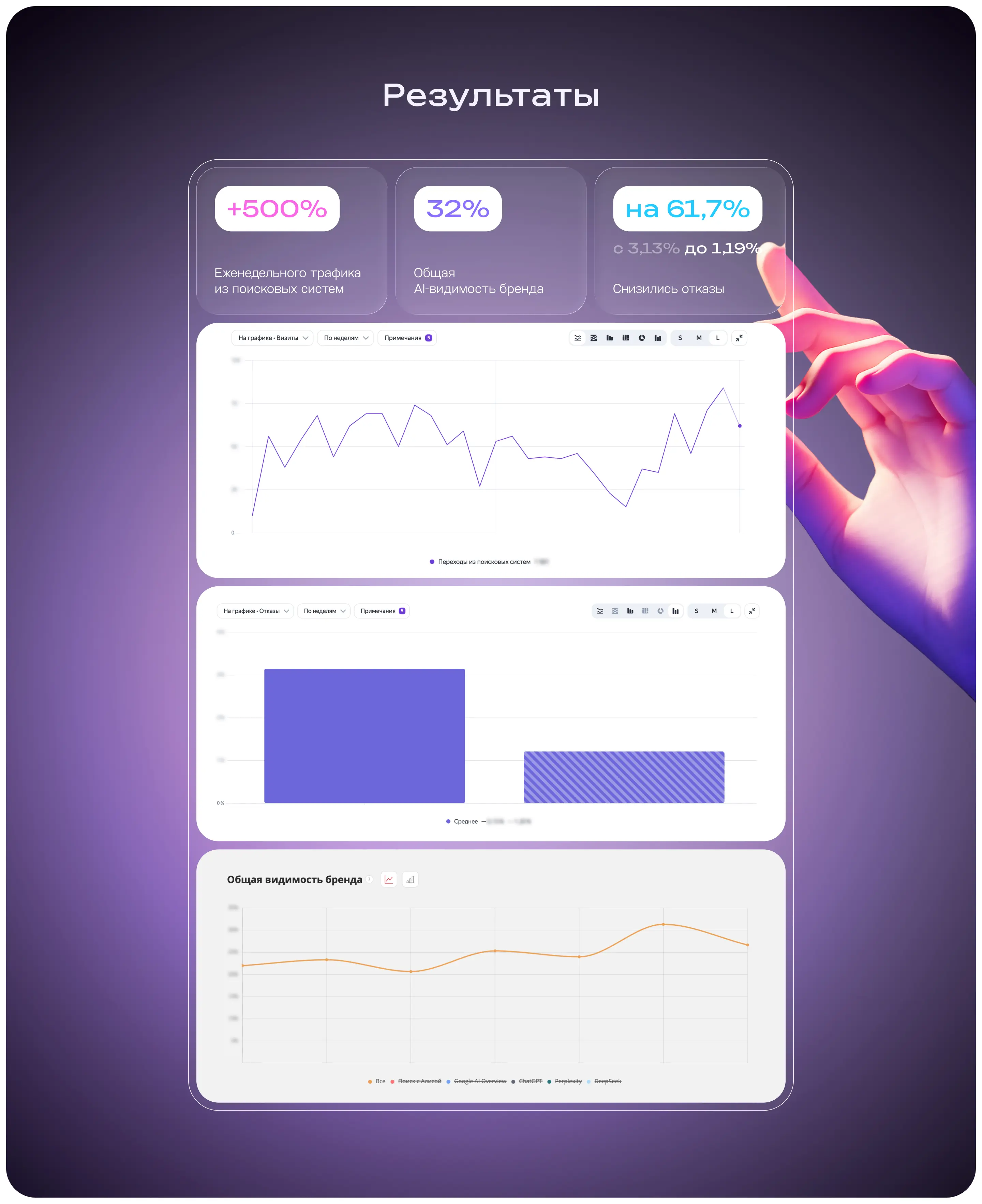Спустя 5 месяцев работы мы получили впечатляющие результаты — еженедельный трафик из поисковых систем вырос на 500%, ежемесячный — на 50%. AI-видимость бренда сейчас составляет около 32%.