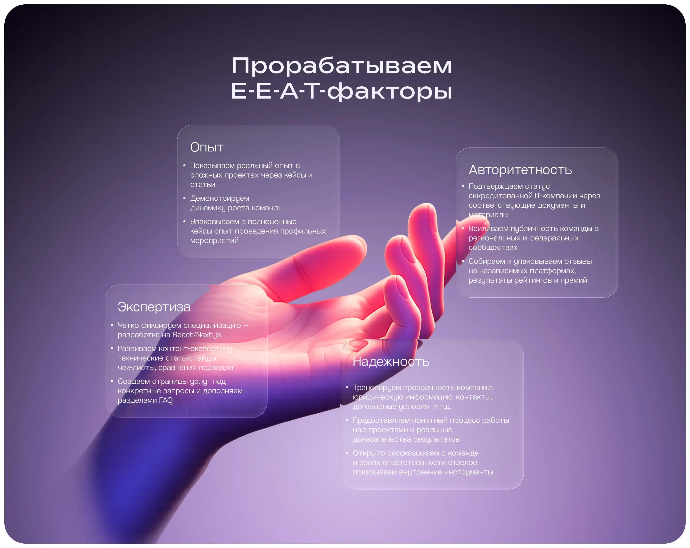 Наша позиция — не разделять SEO и GEO на отдельные пулы задач. Все, что мы делаем в рамках поисковой оптимизации, автоматически отражается на видимости бренда в нейросетях. Однако в GEO есть нюансы, которые необходимо проработать целенаправленно, чтобы взять этот процесс под постоянный контроль.
