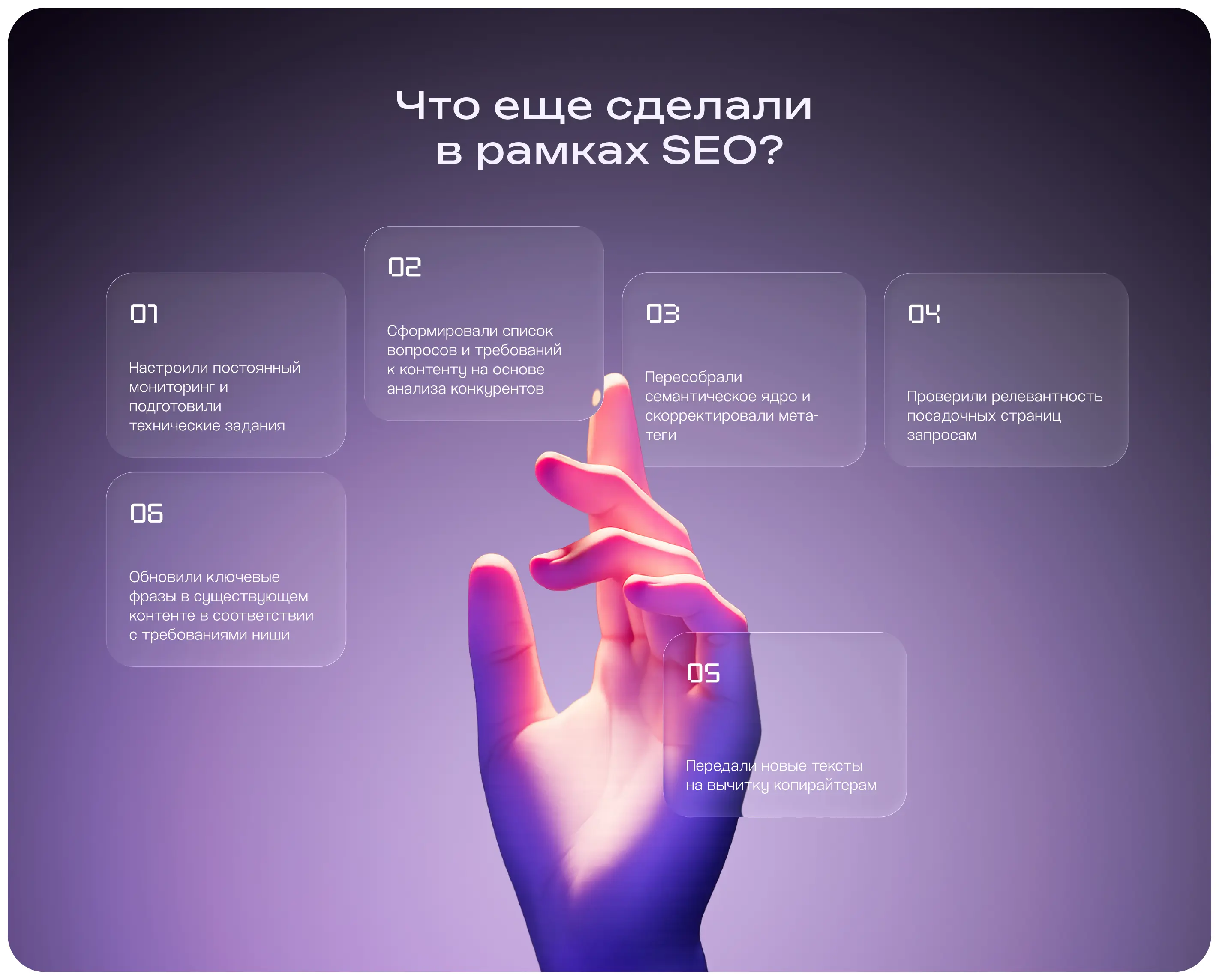 1. Провести дополнительный SEO/GEO-аудит и определить слабые места, которые тормозят продвижение.