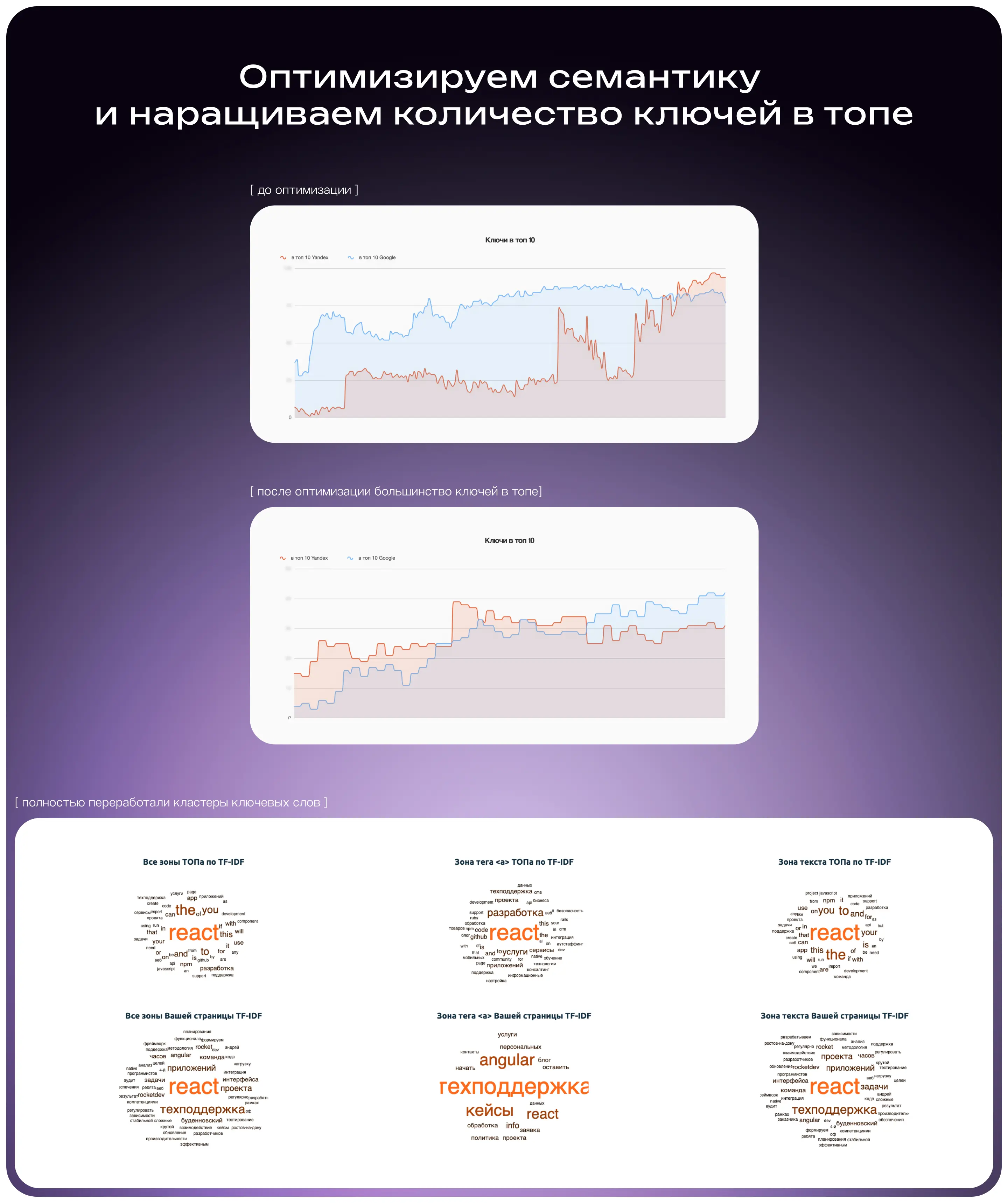Также мы пришли к выводу, что классический сбор семантики перестал приносить результат. Запросы в такой нише формируются не по шаблону. За каждым запросом стоит индивидуальная ситуация, из-за которой человек приходит за техподдержкой или разработкой.