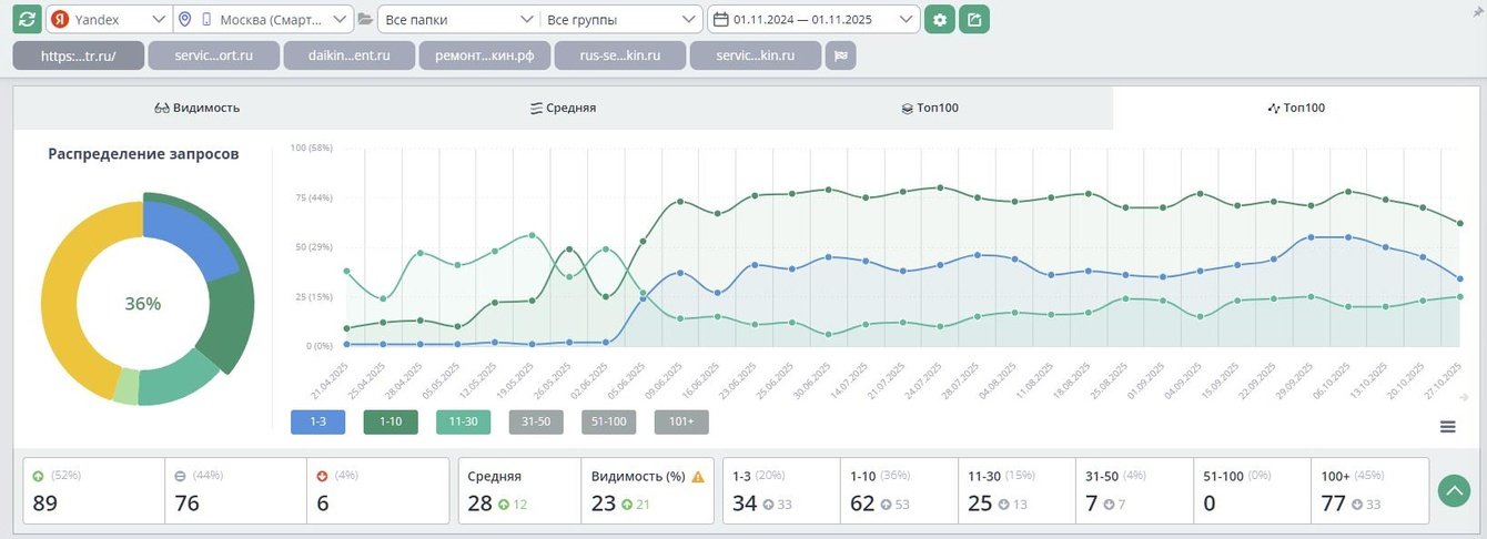 Официальный сервисный центр по ремонту оборудования Daikin столкнулся с несколькими проблемами одновременно. Сайт терял позиции в Яндексе — из 170 возможных запросов в топе оставалось только 14 брендовых (менее 9%). В Google картина была еще хуже: всего 11 ключевых фраз попадали в первую десятку, большинство коммерческих запросов не ранжировались вообще.