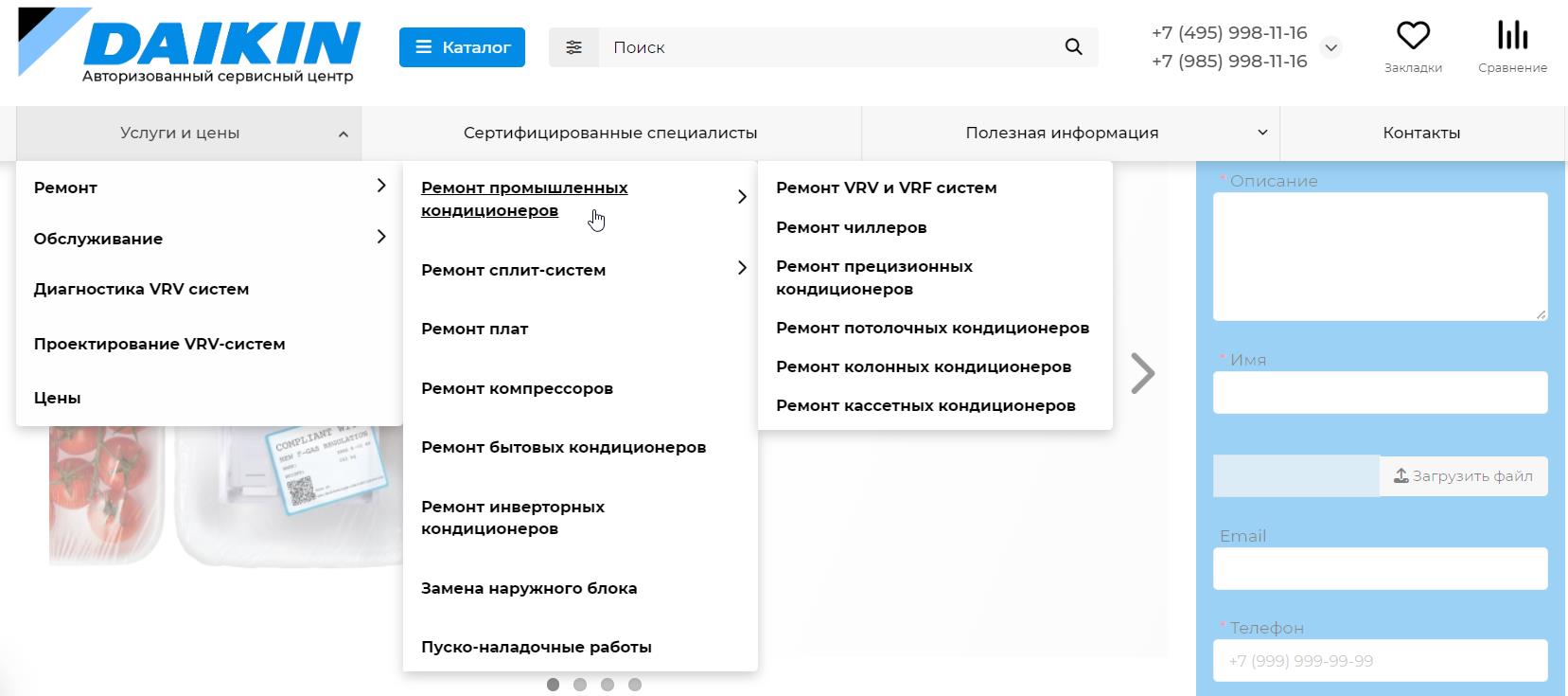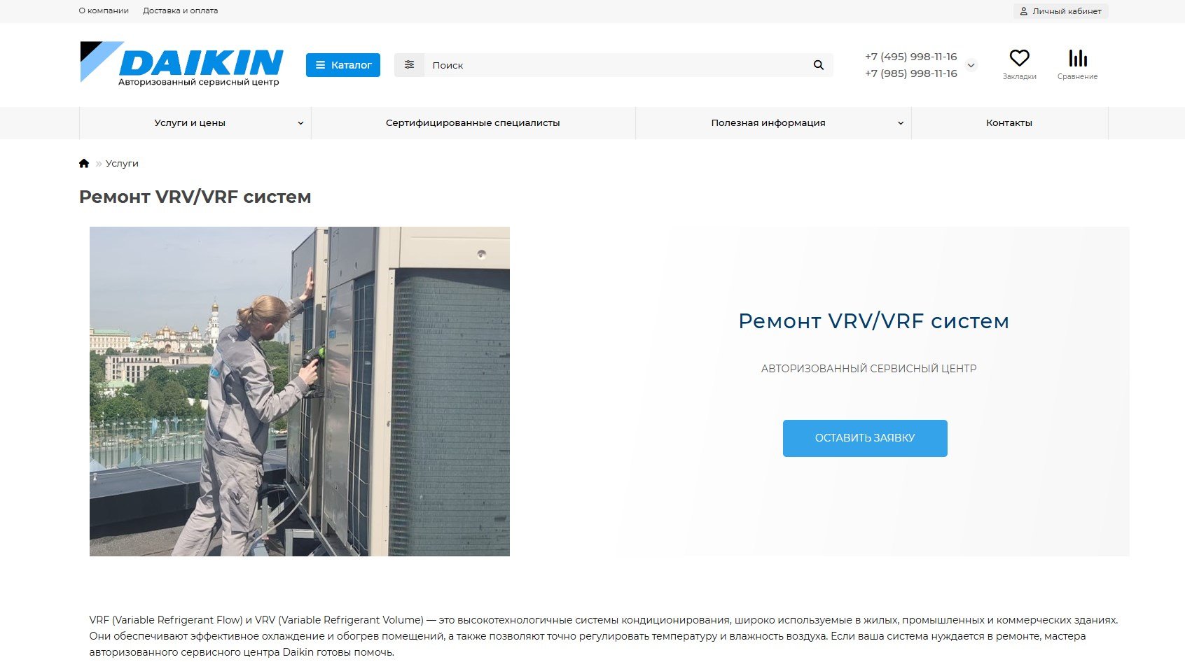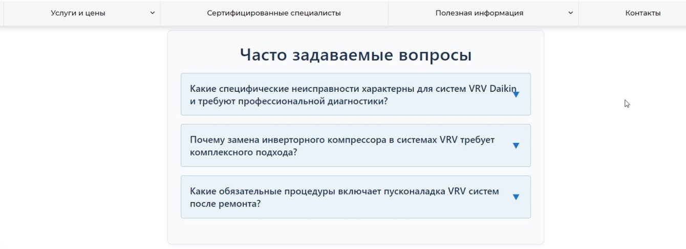 Создали более 30 страниц услуг со сбалансированной структурой. На каждую добавили блоки с FAQ (5-7 вопросов с развернутыми ответами), разместили по 3 отзыва B2B-клиентов, реализовали слайдеры с фотографиями диагностики, актами обследования. Добавили функционал для размещения благодарственных писем от корпоративных клиентов, оптимизировали отдельный сайт по VRV-системам, подготовили уникальные описания для карточек товаров, запчастей.