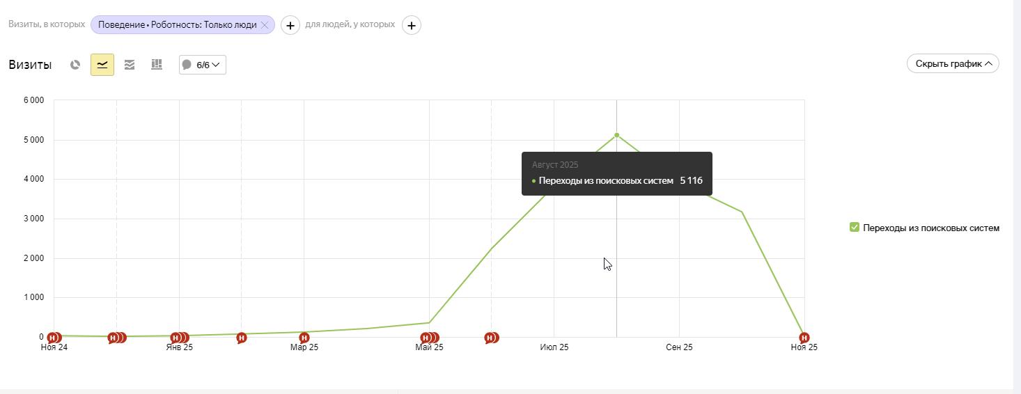 Пик посещаемости пришелся на август 2025 — более 5000 посещений. В конце весны количество посетителей стабильно росло. Проект показал, как комплексный подход способен не только остановить падение, но развернуть ситуацию на 180 градусов. Сайт превратился из неработающей площадки с потерянными позициями в функциональную платформу, привлекающую целевых B2B-заказчиков. Инвестиции в SEO дали прямой результат — увеличение заявок, улучшение качества клиентской базы.