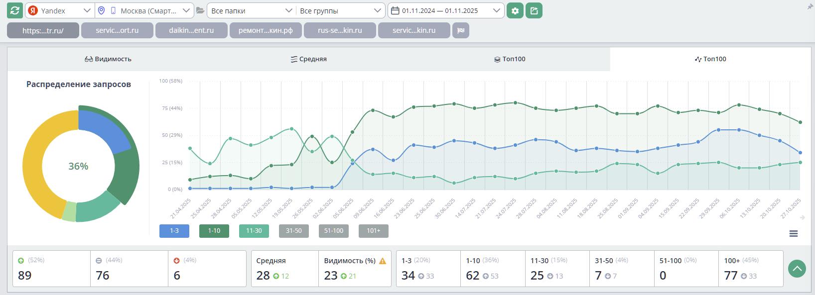 Создали 30+ страниц услуг с оптимизированным каталогом товаров, запчастей. Восстановили все формы сбора заявок, добавили отзывы, FAQ, микроразметку, портфолио. Разместили 24 отзыва с благодарностями от корпоративных клиентов — это повысило конверсию, усилило социальные сигналы. Переориентация на B2B-сегмент (VRV/VRF системы, чиллеры, пуско-наладка) позволила привлекать платежеспособных клиентов вместо простого наращивания общего трафика.