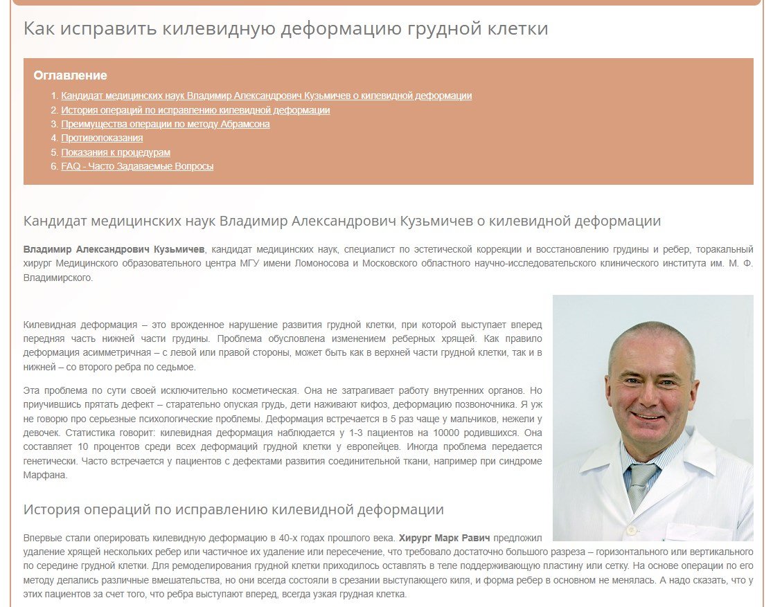 ⦁ Контентная стратегия информационного характера: создание экспертных статей о симптомах, диагностике и методах лечения деформаций грудной клетки
