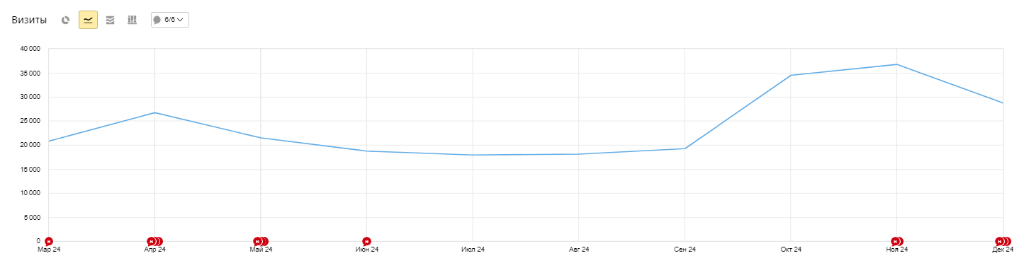 Чтобы покрыть такие запросы, мы заранее планировали актуальные темы, подбирая их под сезонные и популярные тренды. Подготовка велась заблаговременно — за 1-2 месяца до публикации. Такой подход позволил нам создать статьи, которые приносили значительный трафик. Например, одна из наших публикаций ежемесячно набирает около 20 000 визитов, в пике — до 36 000: