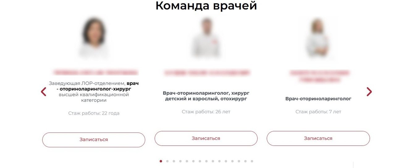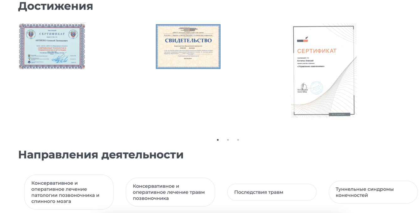 В медицинской нише люди выбирают не просто услугу, а врача. Мы начали с лидеров направлений: собрали данные, оформили биографии, добавили сканы дипломов и сертификатов. Один из врачей прислал нам видеообращение к пациентам — оно вышло настолько тёплым, что мы решили внедрить видео для всех ключевых специалистов. Подтянули отзывы с «ПроДокторов», вывели стаж и рейтинг. В итоге страницы врачей стали самыми просматриваемыми на сайте.