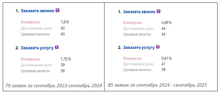 Сайт начал работать, но через 3 года клиент вернулся с новым запросом. В июле 2023 года он решил заняться продвижением. Сначала мы пробовали запускать контекстную рекламу, ведь с помощью неё можно привести “горячий” трафик в быстрые сроки. Однако с небольшим бюджетом реклама не показала достаточной эффективности: трафик был, но конверсии — единичные, а стоимость клика — высокая.