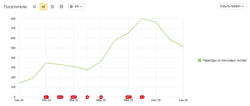 За 2 года SEO-продвижения на сайт подологического центра общий трафик увеличился в 5 раз. По нашему опыту, это очень хороший результат для продвижения только по 1 региону и небольшом бюджете. Рост трафика за период сентябрь 2023 - сентябрь 2025: