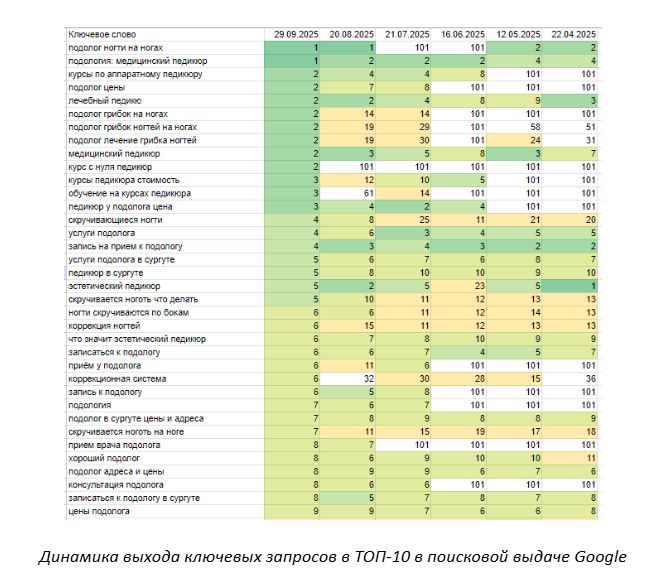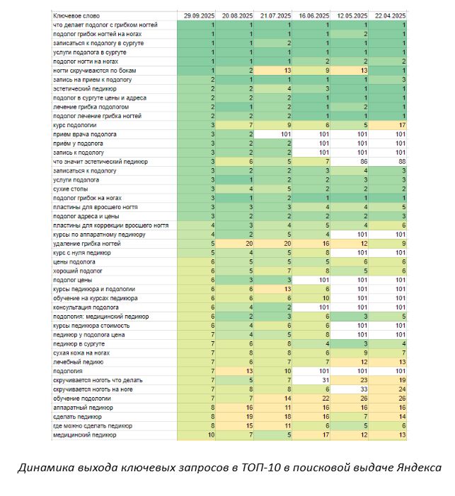 За последние полгода наблюдается устойчивая положительная динамика в росте количества запросов, попадающих в топ поисковой выдачи. Всё больше ключевых фраз выходит в топ-10, как коммерческих («услуги подолога в Сургуте», «запись к подолгу»), так и информационных («что значит эстетический педикюр», «скручивается ноготь что делать»).