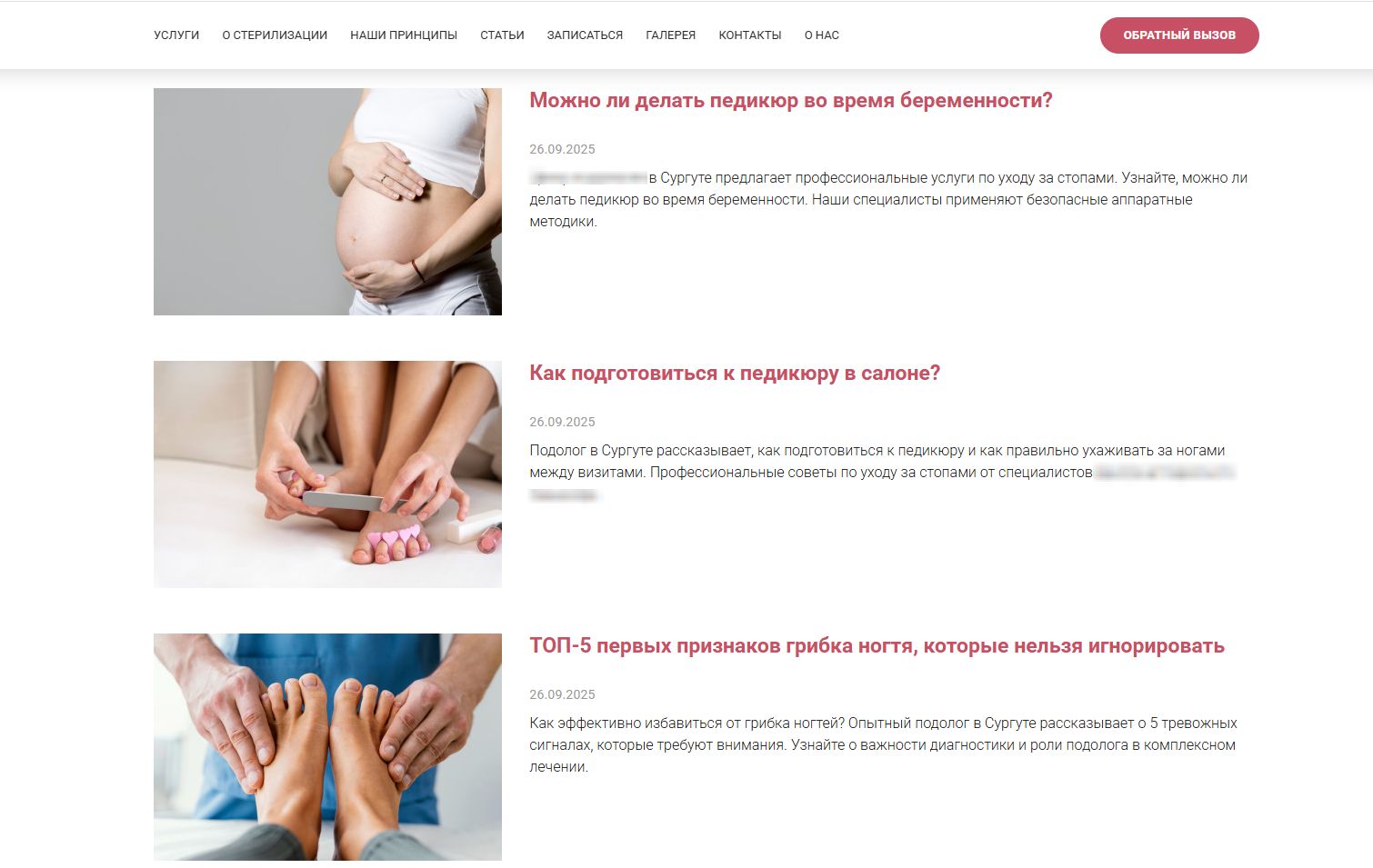 Следующим шагом стал сбор семантического ядра. Мы проанализировали более 2000 ключевых запросов и выделили коммерческие направления и информационные темы. На основе ядра разработали стратегию: сформировать структуру сайта, создав под каждое направление услуги отдельные страницы, а в блог — регулярно писать статьи, объясняющие, что делает подолог, какие методы ухода применяются, когда обращаться за помощью.