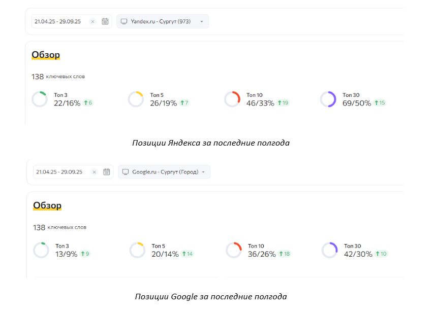 Следует отметить, что наибольший рост позиций зафиксирован в Яндексе. Это может быть связано как с большей релевантностью сайта для алгоритмов Яндекса, так и с предпочтениями пользователей Сургута, которые чаще выбирают именно эту поисковую систему.