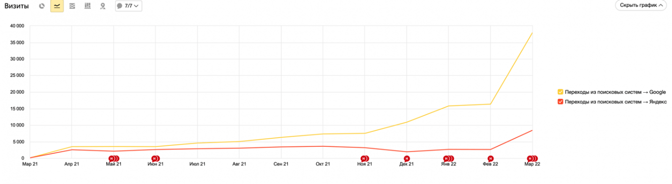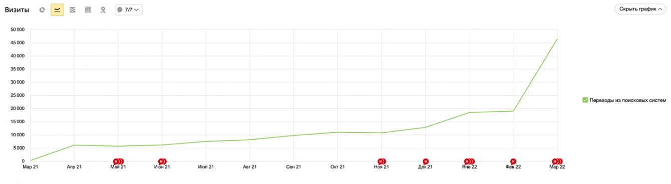 Благодаря комплексному подходу к разработке и продвижению удалось достичь плавного и естественного роста количества переходов из поисковых систем по информационным запросам.