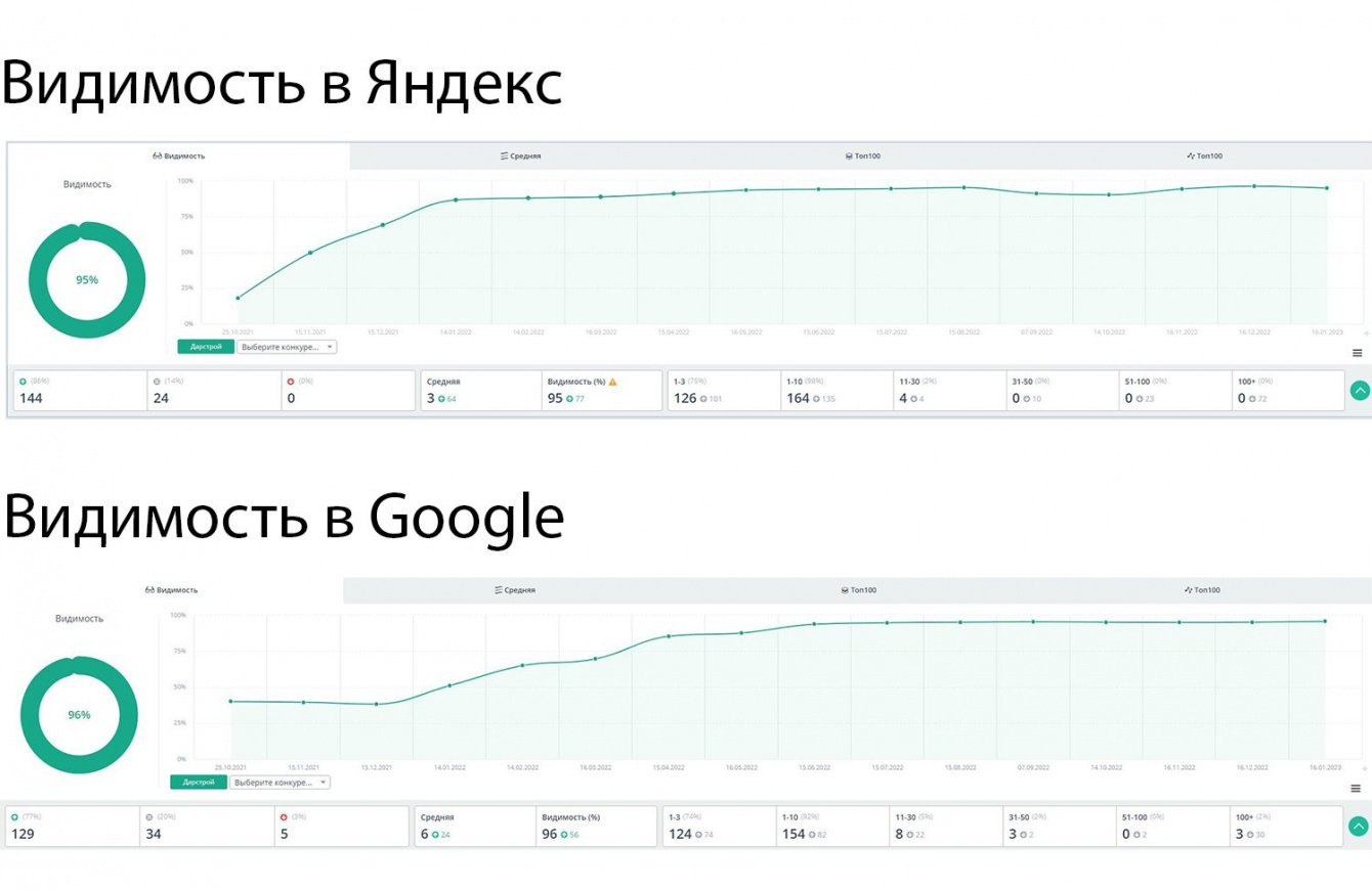 За период SEO-продвижения (7 месяцев) нам удалось поднять видимость сайта в Яндекс и Google до показателей свыше 90% во всех регионах продвижения.