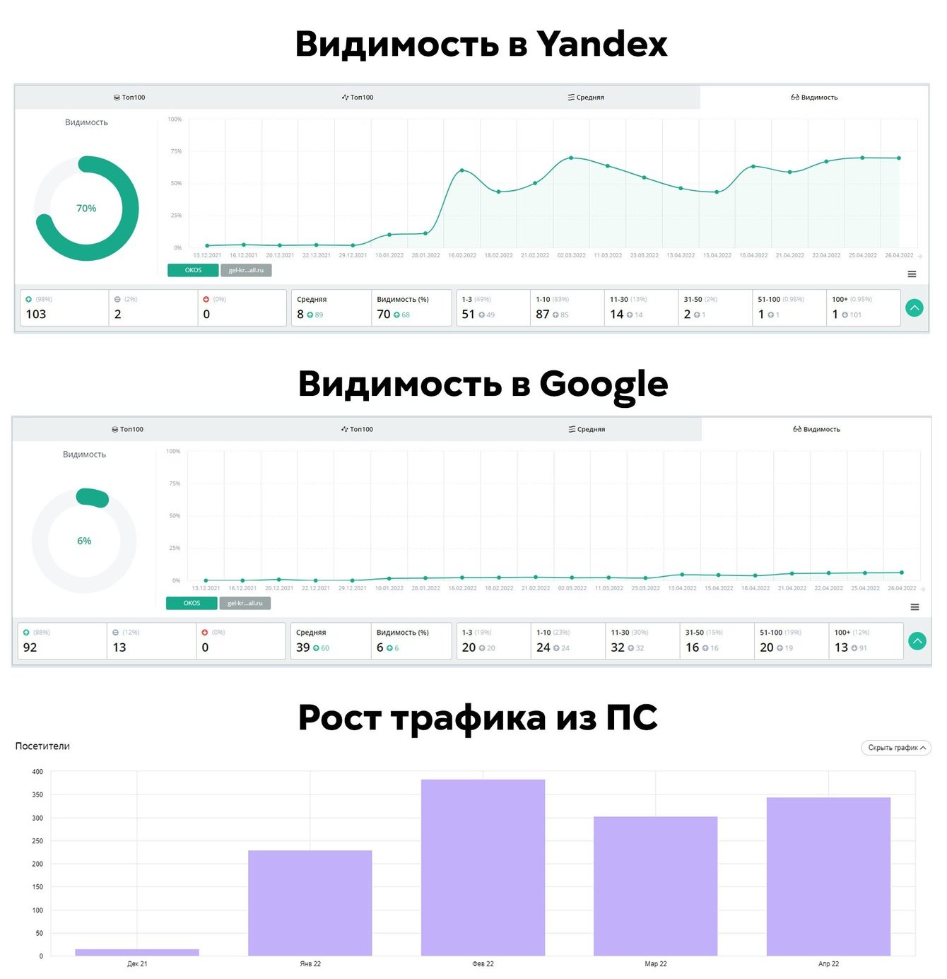 Несмотря на множество ощутимых сложностей в продвижении, за ~4 месяца нам удалось увеличить видимость сайта в Яндекс с 1% до 70% и получить медленный, но стабильный рост в Google. Сейчас работы над проектом еще не закончены. Планируется и дальше проводить комплекс мер по внешней ссылочной оптимизации. Усилению бренда и его репутации.