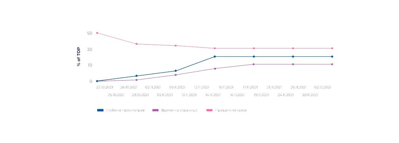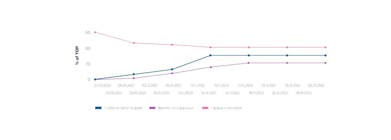 Улучшились поведенческие факторы: снизился процент отказов, увеличилась глубина просмотров, повысилось время, проводимое на страницах, стало больше прямых переходов (почти на 30%)