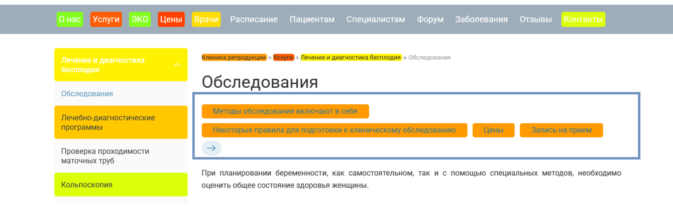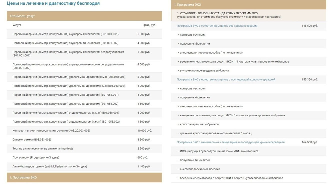 Для некоторых страниц прайс-листы стали достаточно объёмными, ведь пришлось учесть все возможные варианты услуг, как, например, на странице «Лечение и диагностика бесплодия»: