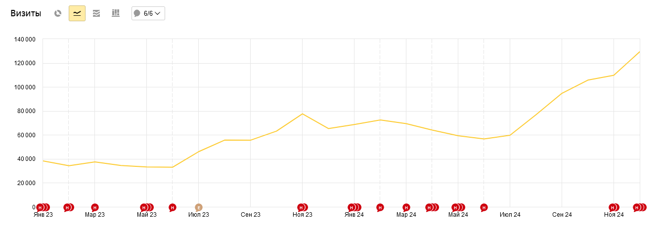 Оптимизация сайта — это всегда игра в долгую. Когда все быстрые способы нарастить трафик уже проработаны, на преодоление стагнации может потребоваться время. Весь 2023 год мы активно вносили изменения в структуру, дизайн и работали с контентом сайта. И осенью начали пожинать первые плоды. Хотя основной рост трафика пришёлся уже на 2024 год.