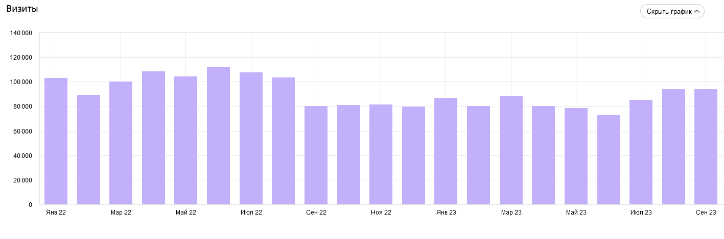 Оптимизация сайта — это всегда игра в долгую. Когда все быстрые способы нарастить трафик уже проработаны, на преодоление стагнации может потребоваться время. Весь 2023 год мы активно вносили изменения в структуру, дизайн и работали с контентом сайта. И осенью начали пожинать первые плоды. Хотя основной рост трафика пришёлся уже на 2024 год.