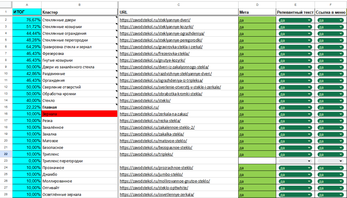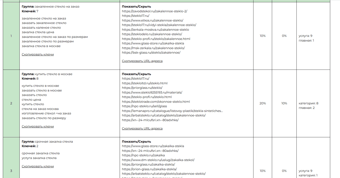 Вручную сравниваем URL-адреса конкурентов по содержанию контента. Добавляем такие блоки, как «преимущества», «сравнительная инфографика», «faq», «таблица с ценами» и т.д. Мы удобно всё сводим это в специальную форму в Google-таблицах. После чего составляется карта контента, и менеджер продукта запрашивает информацию у заказчика. Пример типовой страницы после наполнения https://zavodstekol.ru/zakalennoe-steklo-2/.