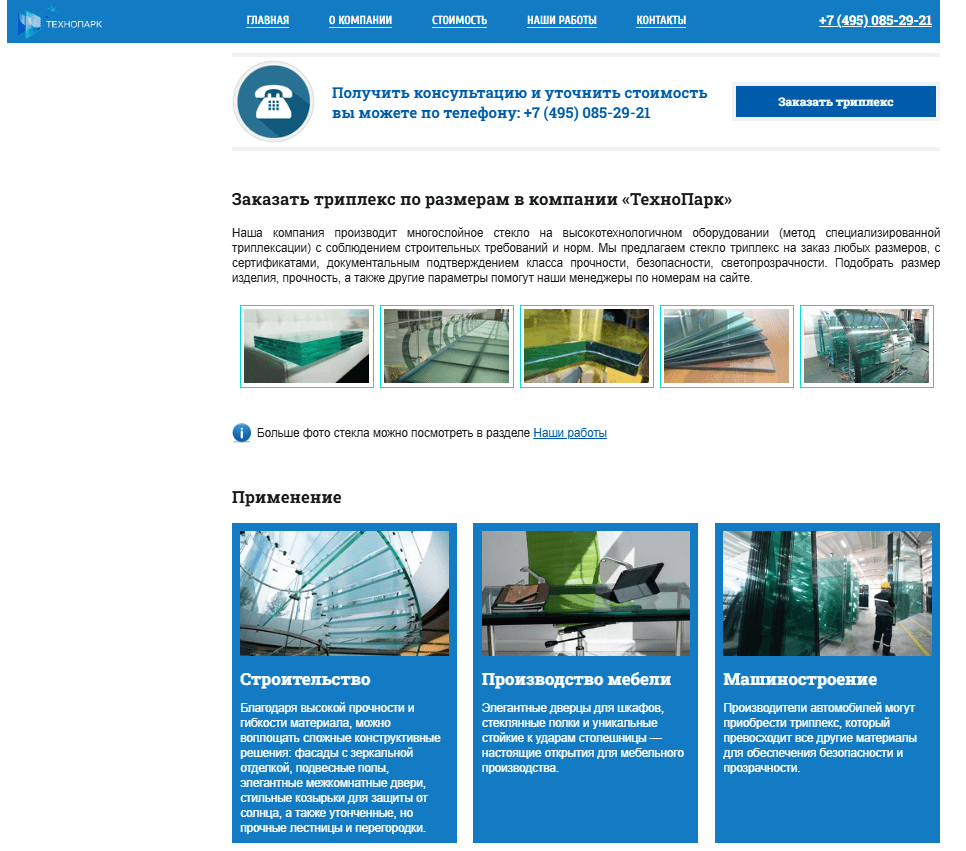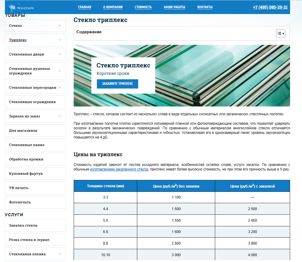 1. Разделить структуру сайта на 2 блока: товары и услуги. Фактически, компания оказывает только услуги по обработке и не производит само стекло. Но для поисковиков это разные направления. Например «закаленное стекло» - это товарная страница. А «закалка стекла» - это страница услуги. На самом деле, это одна и та же услуга. Компания нашего клиента закупает «сырое» стекло и обрабатывает его под заказчика.