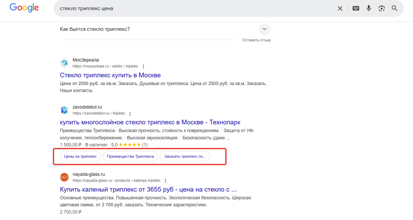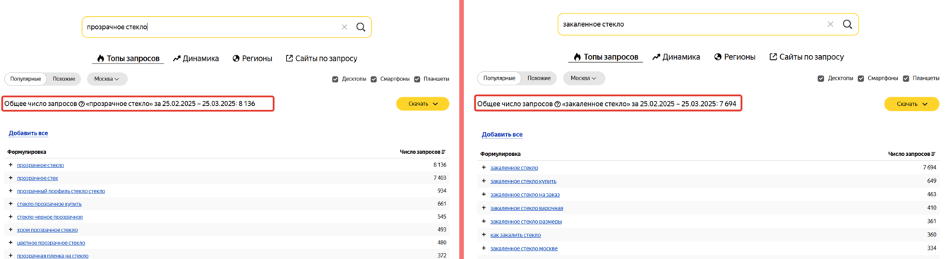 На стадии группировки и анализа конкурентов мы замечаем интересный факт. Многие конкуренты создают отдельный блок страниц под направления «товары» и «услуги». В них есть смысловые пересечения. Например: услуга по закалке стекла и изготовление закаленного стекла. Для поиска это принципиально разные вещи. Поэтому мы создаем 2 разных блока страниц в меню сайта и разделяем такие запросы. За основу берем конкурентов с высокой видимостью: priorglass.ru и glass-store.ru.