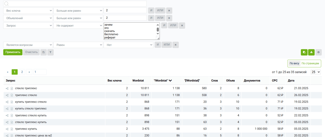 После выделения «топовых» URL-адресов в сервисе keys.so (инструмент – список запросов страниц) выгружаем все дополнительные ключи и фильтруем их по фильтру.
