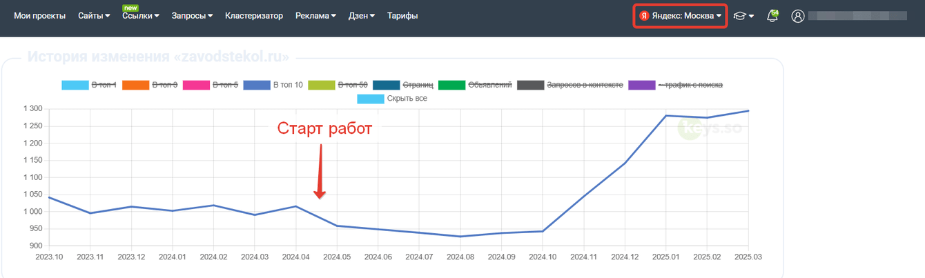 1. Рост запросов в ТОП-10 Яндекс по Москве с 920 до 1300 ключей. Основной рост пришелся на ключевые коммерческие страницы.