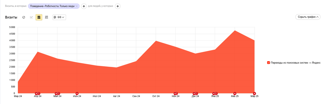 2. Рост трафика в Яндекс с 2 600 до 4 800 пользователей в месяц за 9 месяцев работ