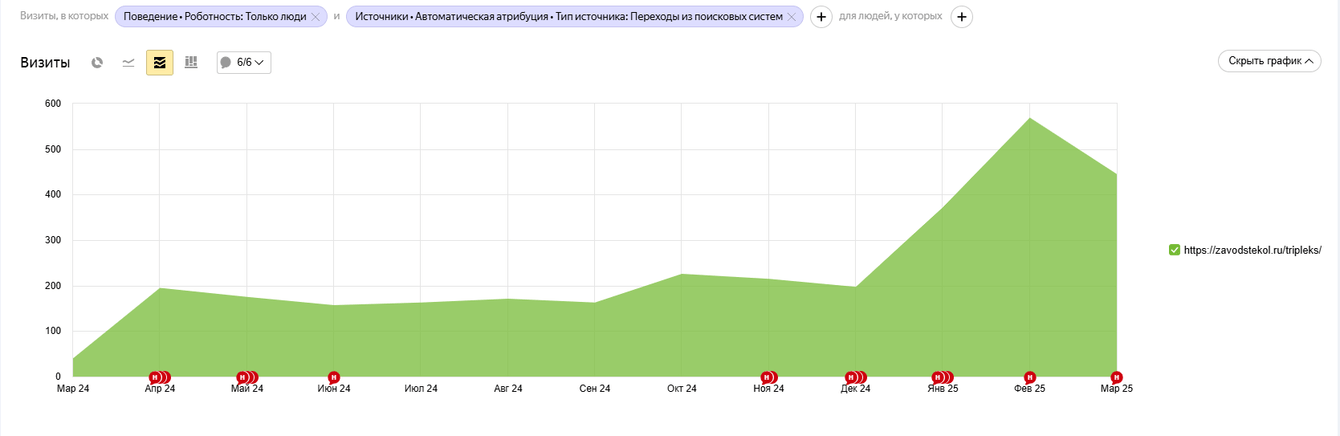 3. Существенная доля роста по ключевой странице для b2b-сегмента – стекло триплекс. Рост входящего трафика на страницу из поисковых систем со 160 до 570 пользователей в месяц.