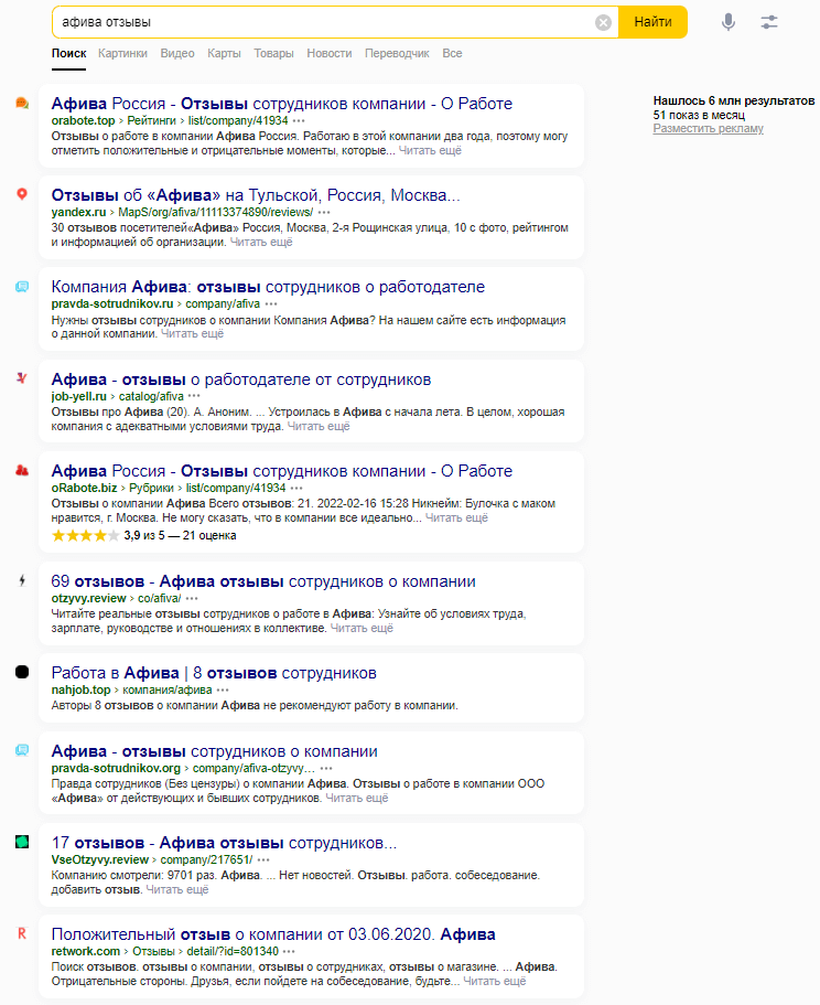 В рамках SEO искоренить проблему испорченного имиджа было проблематично, так как здесь не подразумевается выяснение отношений с бывшими сотрудниками (реальными или, как в нашем случае, фейковыми). Поэтому, когда сформировался оффер по SERM, «Афива» стала первой, кому мы предложили проработать данное направление. Забегая вперед скажу, что нам все удалось! Неправдоподобные и откровенно клеветнические мнения сотрудников о работодателе постепенно ушли и продолжают уходить из топа выдачи поисковиков.