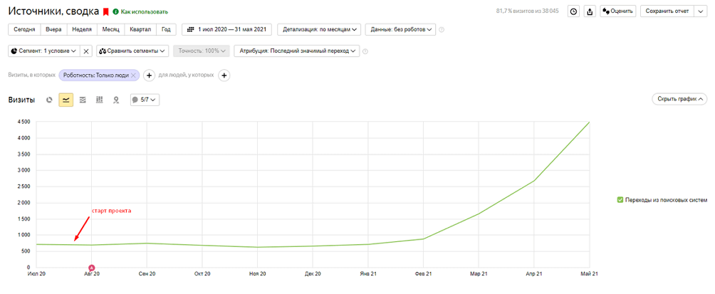 Это дало свои плоды: со временем начался устойчивый рост трафика из поиска, и к 11-му месяцу продвижения он стал в 6 раз выше стартового.