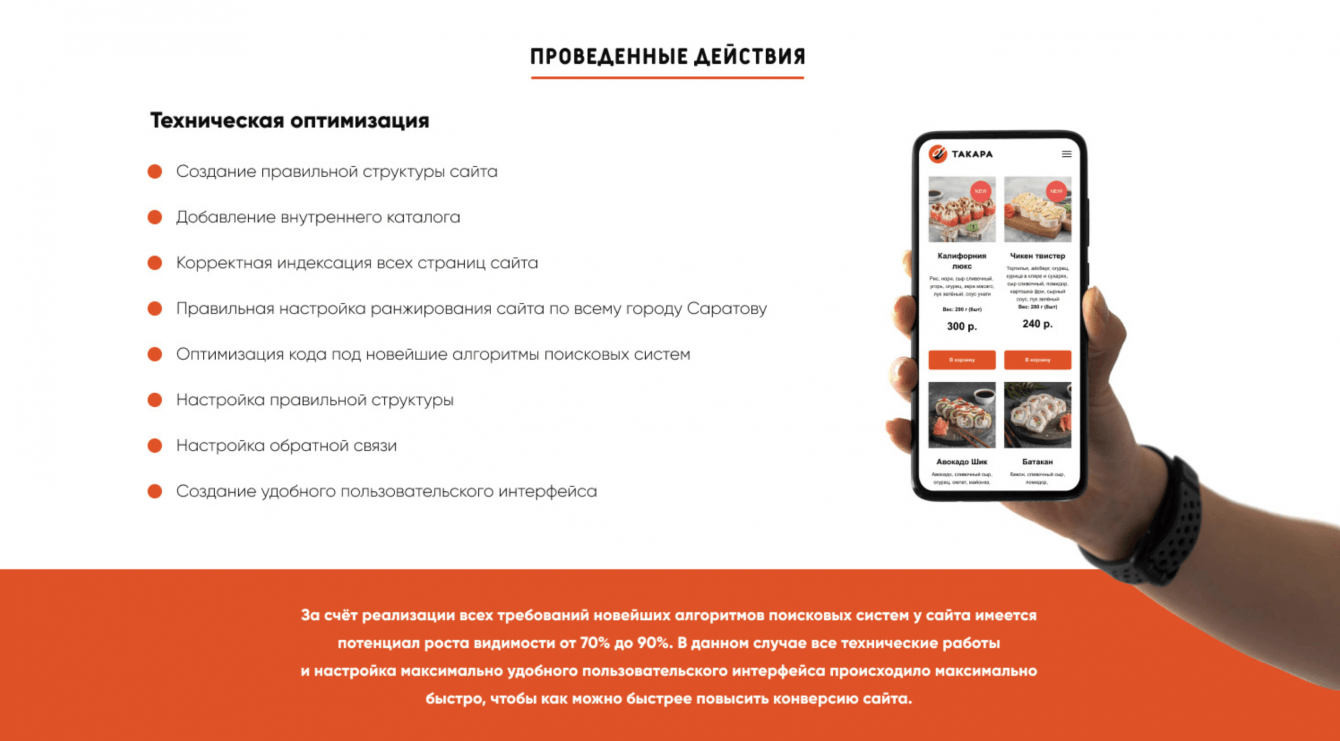 Доставка блюд японской и европейской кухни имеет высокую конкуренцию, и от нас требовалось сделать так, чтобы как можно больше пользователей переходило на сайт "Такара". Проведение SEO-оптимизации являлось одной из основных задач для улучшения контакта с потребителем. Нам потребовалось выполнять следующие основные задачи: