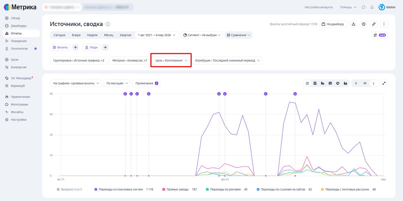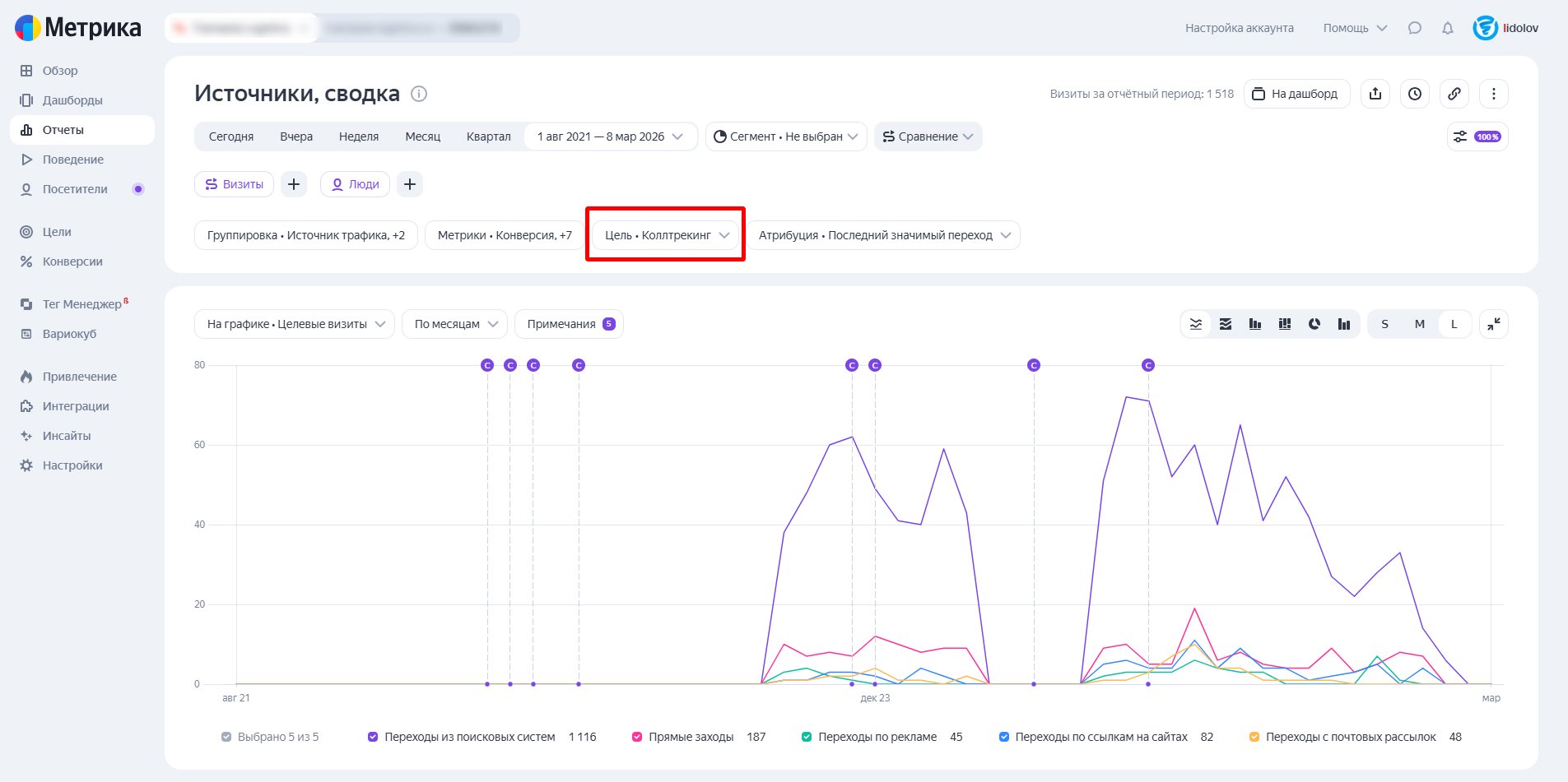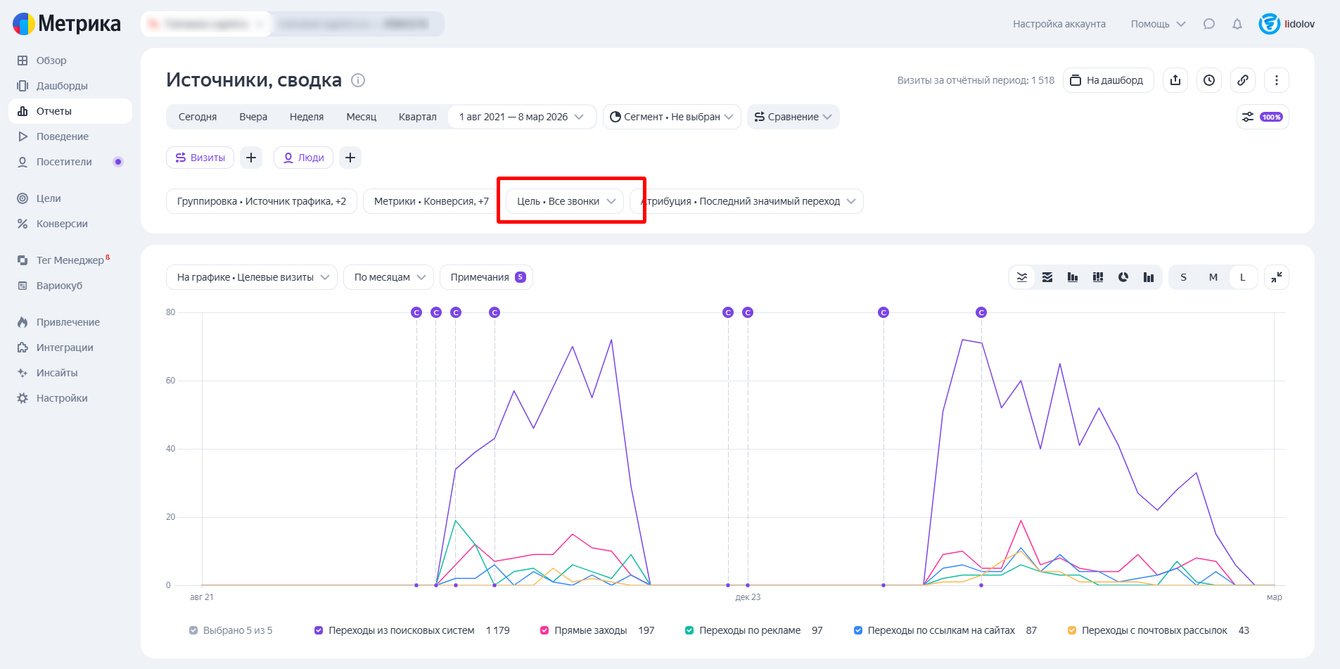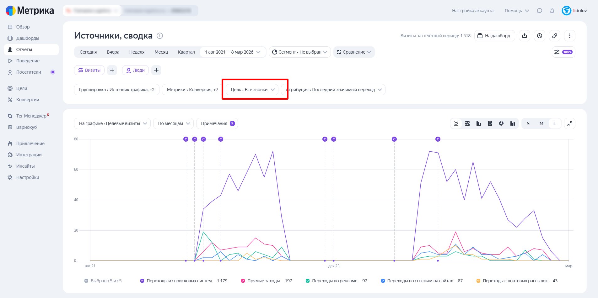В нашем случае в разные периоды нестабильно работали звонки, письма и часть целей в Метрике. Данные по обращениям собирались кусками: отдельные события фиксировались с разрывами, часть периодов выпадала полностью.