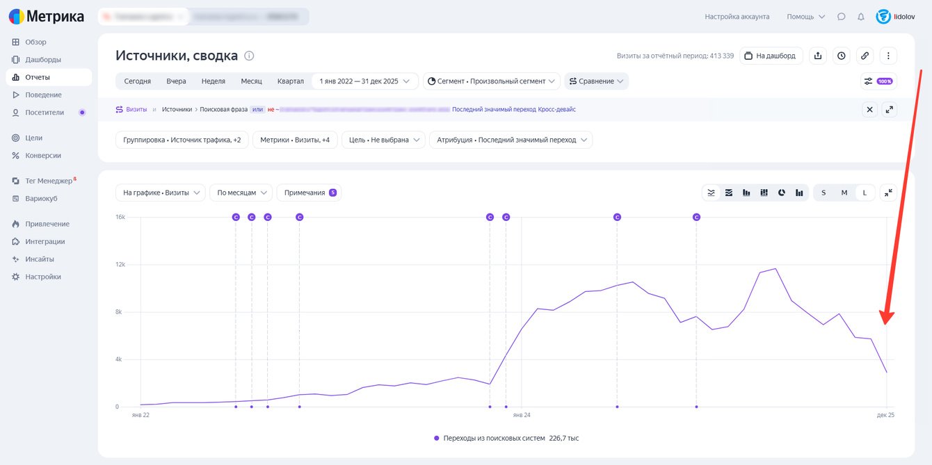 На этом проекте рост держался не на разовых работах, а на базовых вещах: структуре под реальный спрос, скорости внедрений, рабочих коммерческих элементах сайта и аналитике, которую ведут согласованно, а не кусками. Пока сохранялись структура, темп внедрений и нормальная логика работ, сайт рос. Когда перестали вести квалификацию, аналитику начали собирать несогласованно, а затем заменили сайт без миграции, результат быстро закончился.