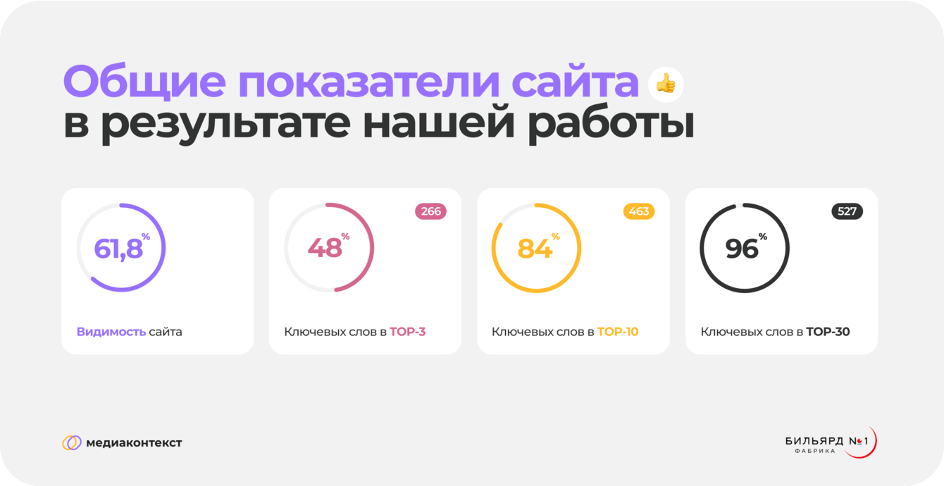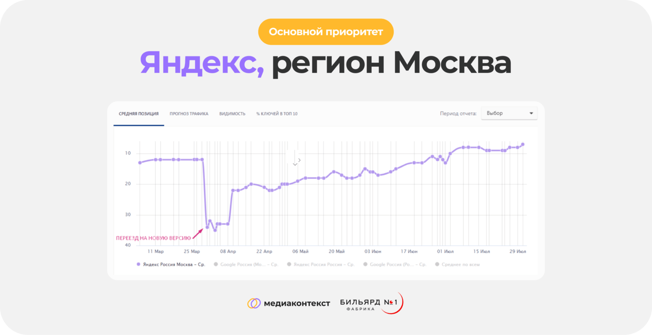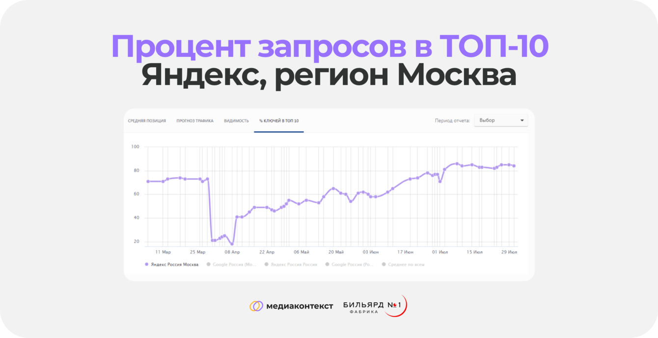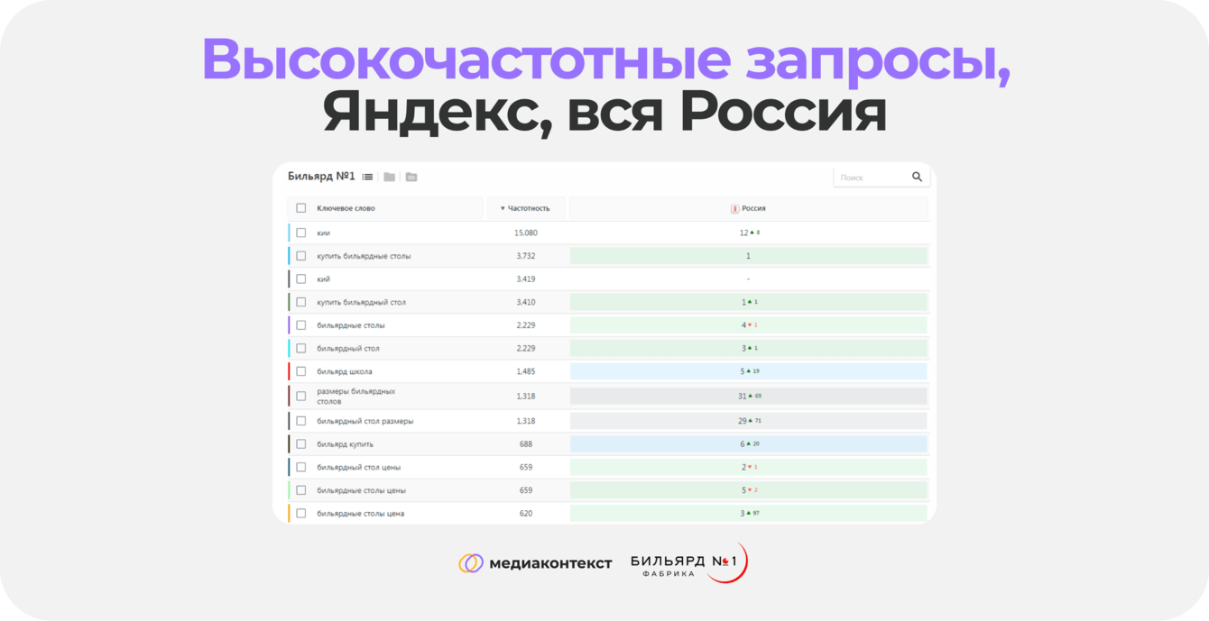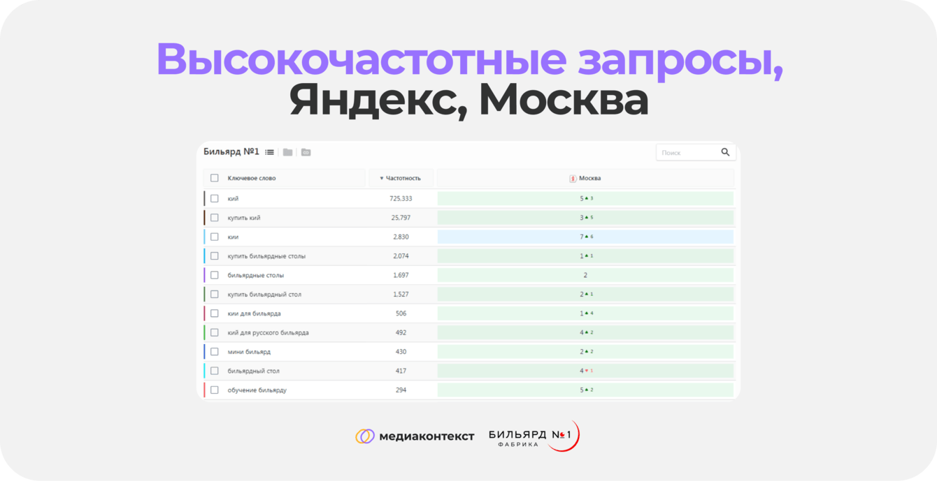 Клиенту были очень важны самые высокочастотные запросы из нашего семантического ядра по категориям «Бильярдные столы», «Бильярдные кии». В результате продвижения мы достигли таких результатов по поисковой системе Яндекс в регионе Москва: