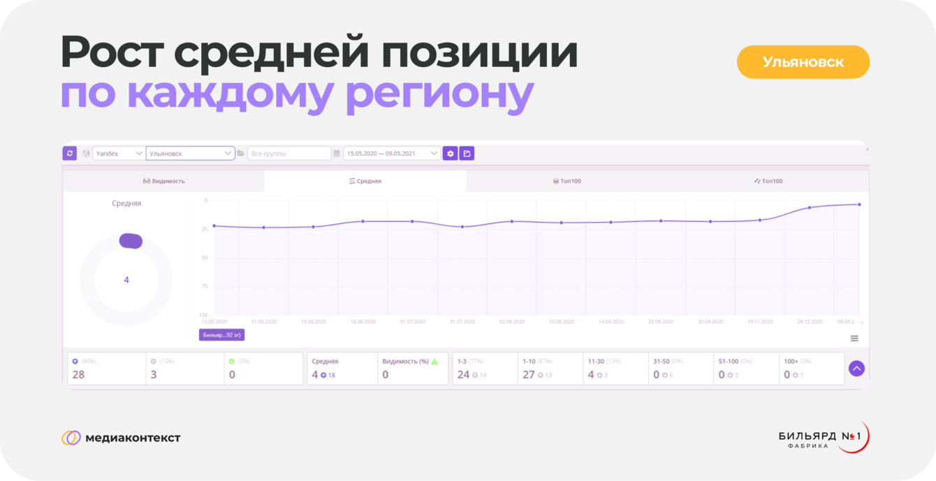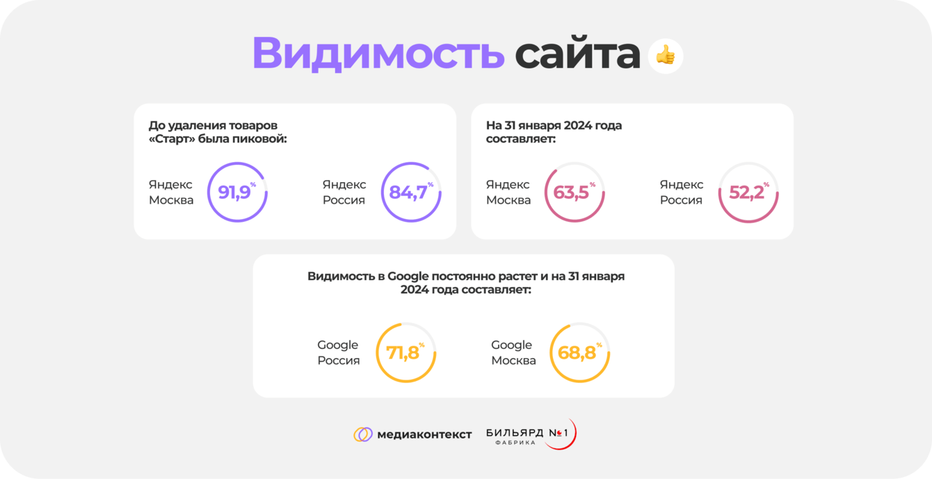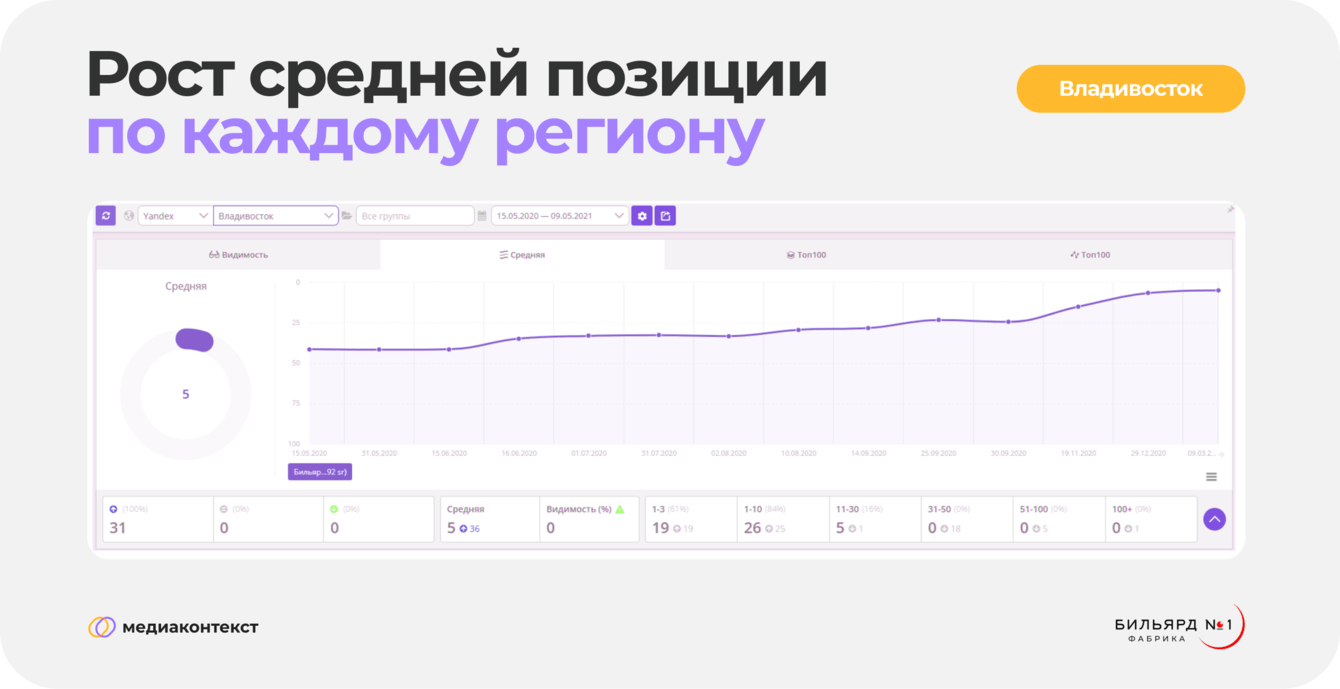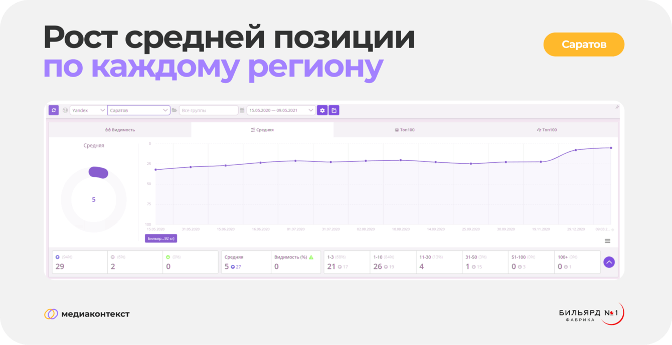 Клиенту были очень важны самые высокочастотные запросы из нашего семантического ядра по категориям «Бильярдные столы», «Бильярдные кии». В результате продвижения мы достигли таких результатов по поисковой системе Яндекс в регионе Москва: