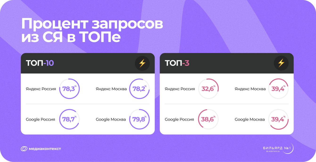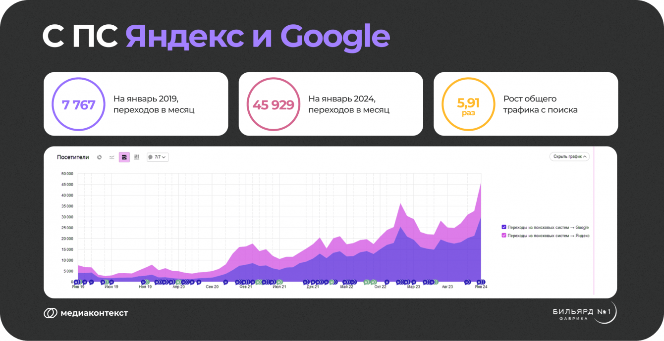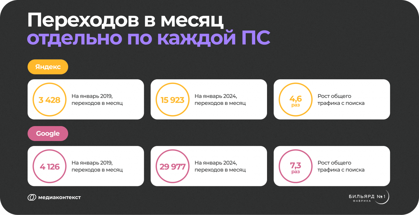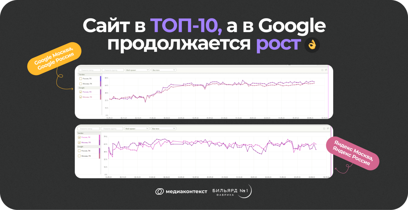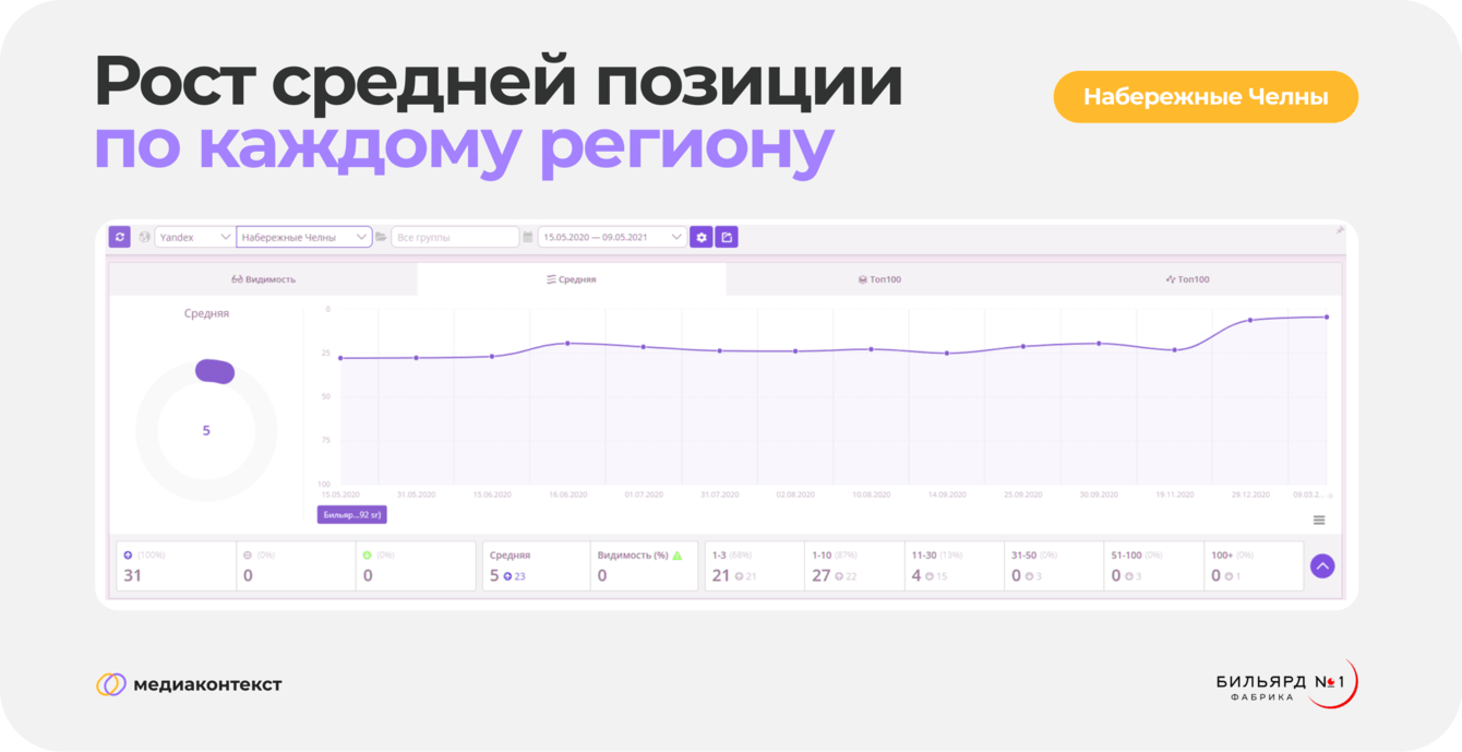 Клиенту были очень важны самые высокочастотные запросы из нашего семантического ядра по категориям «Бильярдные столы», «Бильярдные кии». В результате продвижения мы достигли таких результатов по поисковой системе Яндекс в регионе Москва: