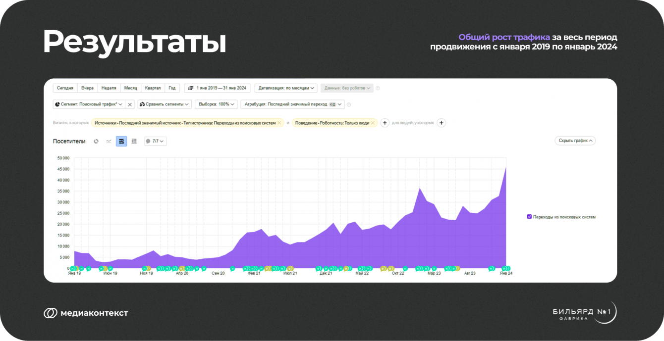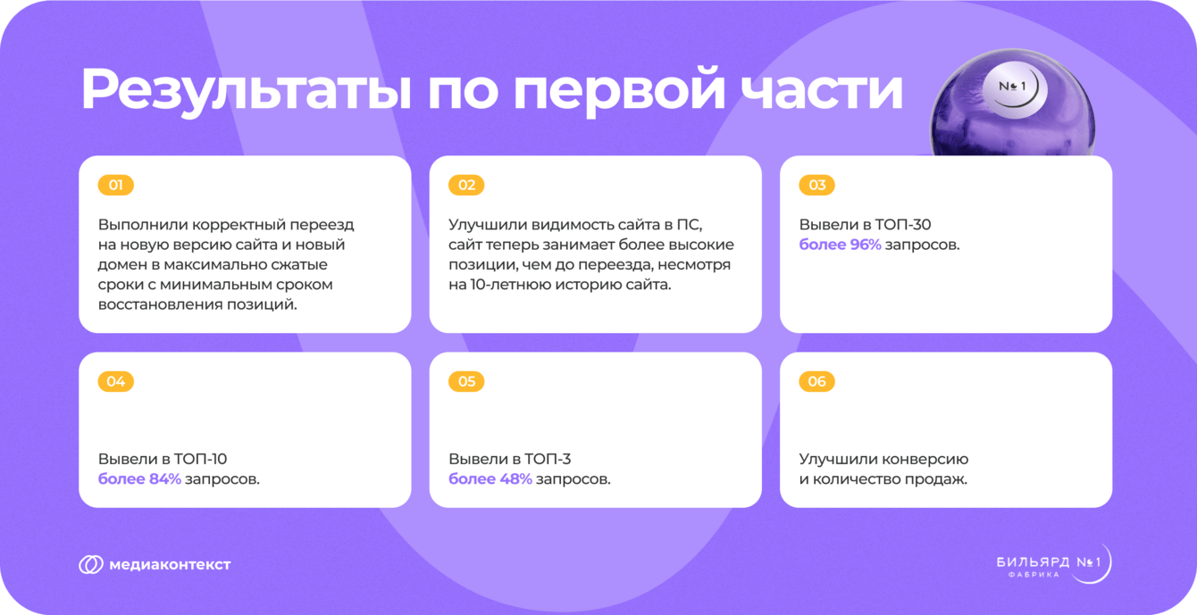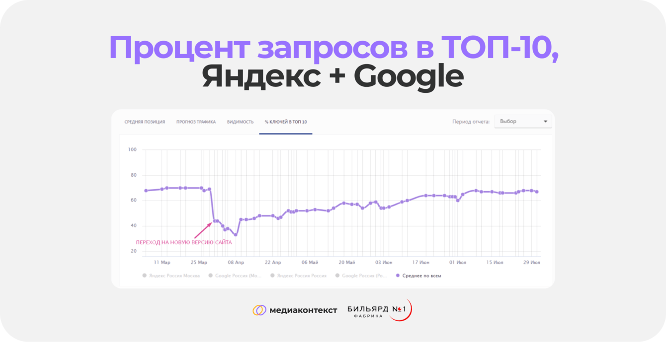 Мы выполнили SEO-аудит новой версии сайта и начали выполнять правки по этому аудиту. Проработали все технические, коммерческие, поведенческие факторы.