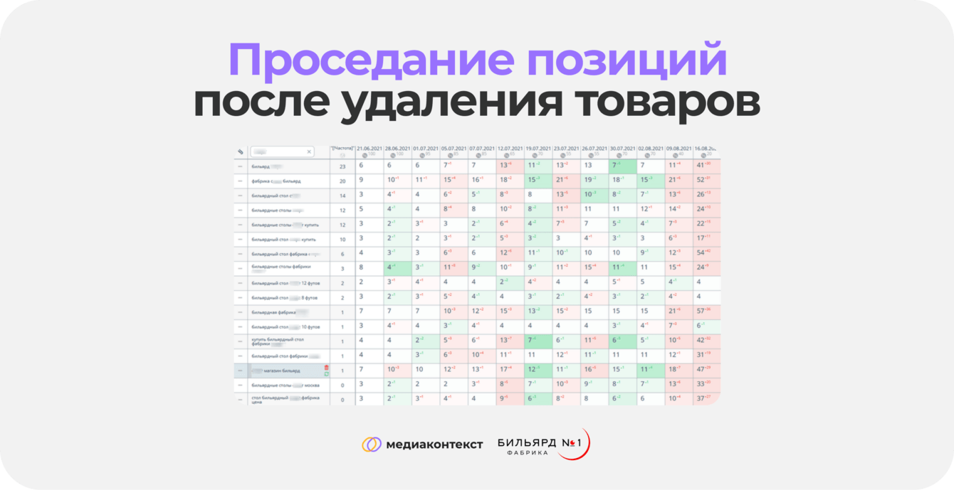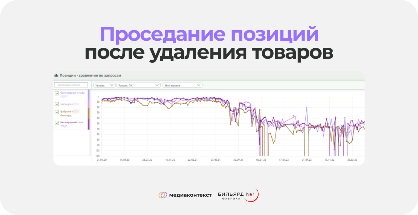 В июле 2021 клиент самостоятельно удалил с сайта весь товар самого популярного бренда, который составлял значительную долю ассортимента. Так как редиректы проставлены не были, позиции по этому пулу запросов просели: