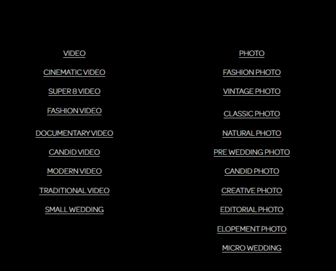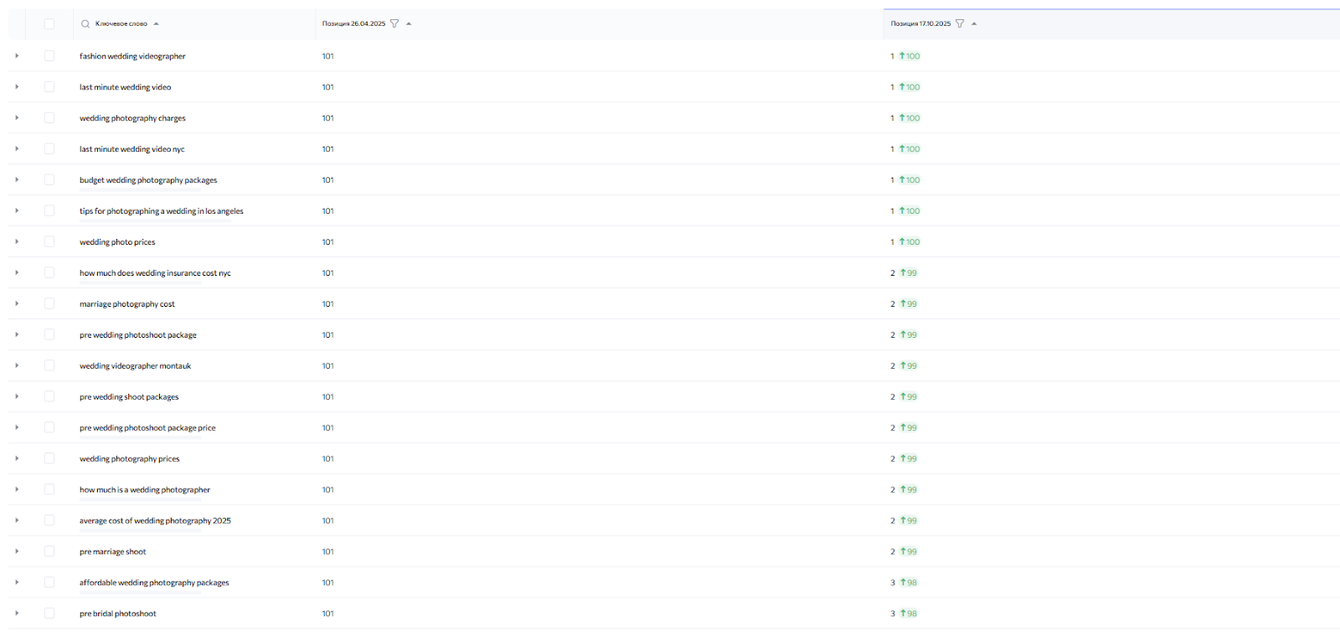 Далее перешли к расширению структуры сайта. Мы предположили, что отдельные страницы под конкретные типы съемок смогут дать быстрый результат. Такие запросы менее конкурентны, но при этом часто совпадают с реальными поисковыми фразами: пользователи ищут не просто «wedding videographer», а, например, «cinematic wedding video» или «pre-wedding photo».
