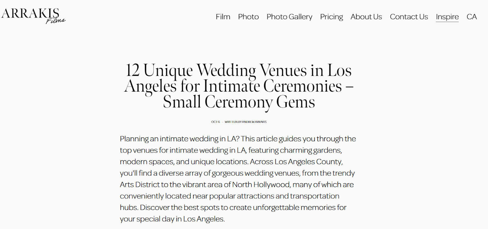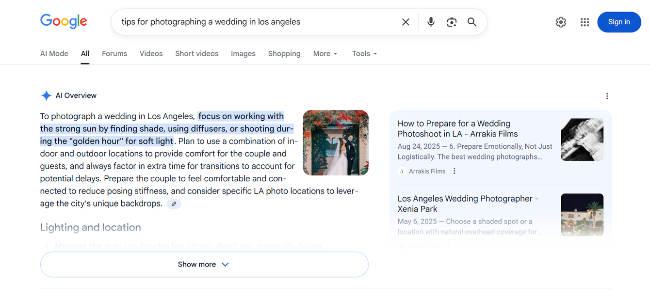 Мы создали и опубликовали страницы под фото- и видеосъемку в Лос-Анджелесе по тому же принципу, что и для Нью-Йорка: с четкой структурой, галереями и оптимизацией под локальные запросы. К моменту, когда команда Arrakis Films Wedding приступит к съемкам в новом городе, сайт уже будет занимать хорошие позиции в выдаче и сможет привлекать локальные заявки. Кроме того, мы сделали и блоговые статьи про свадебную фотосъемку в Лос-Анджелесе.