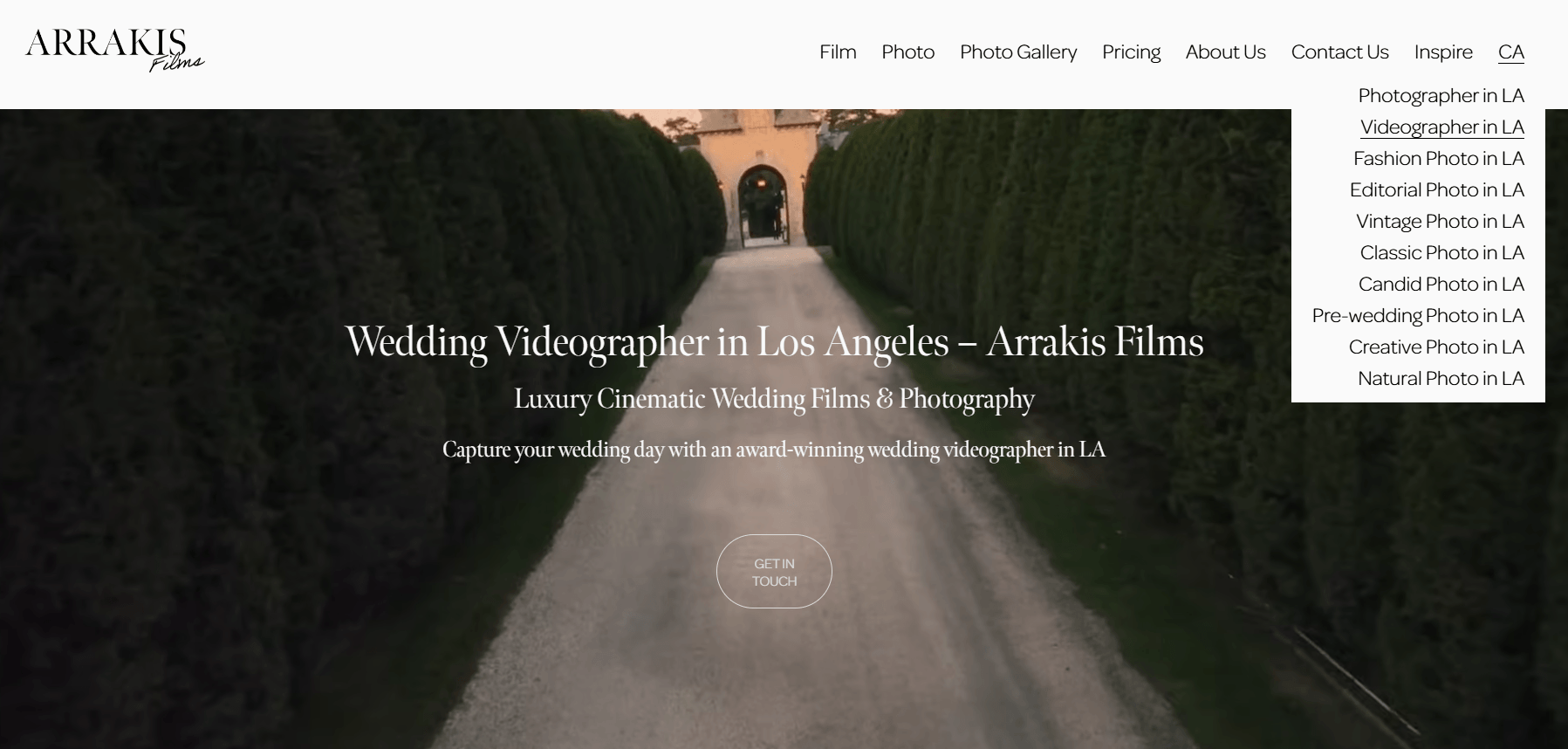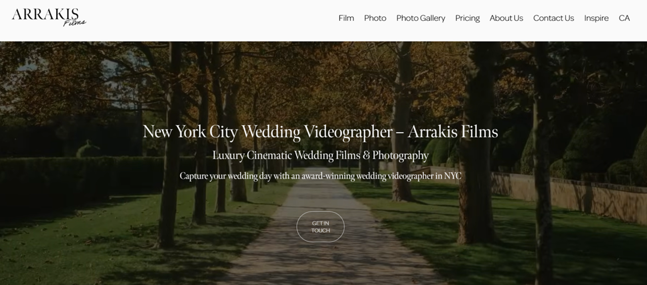 Так выглядит главная сайта Arrakis Films Wedding: акцент сделан на услугах видеосъемки. На других страницах мы сделали акцент на УТП студии, добавили блоки с примерами работ и усилили локальную привязку к Нью-Йорку. Страницы структурировали так, чтобы и поисковику, и пользователю было понятно: здесь можно заказать свадебную съемку именно в этом регионе.