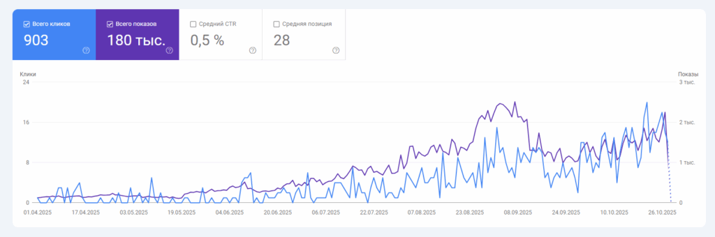 — В апреле-мае 2025-ого сайт получал всего 20-25 кликов ежемесячно, а в сентябре 2025-ого — уже 200+.