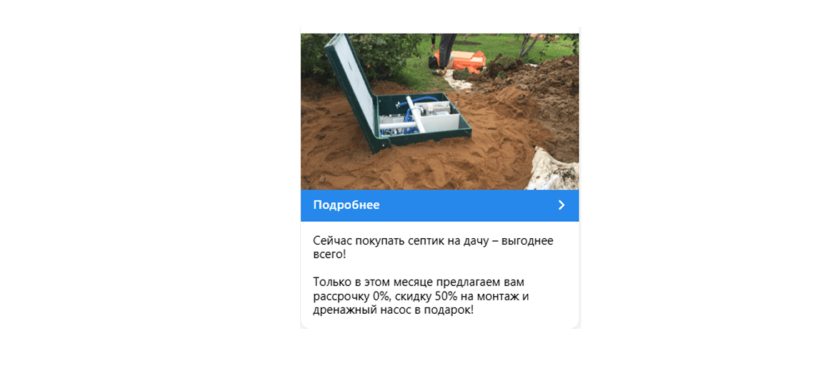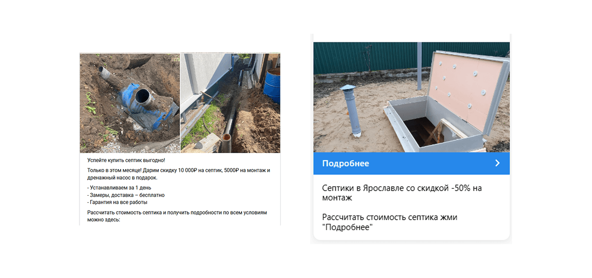 Отдельно настраивали рекламу на подписчиков сообществ о стройке, ремонте и дачной тематике. Если человек читает такие группы, велика вероятность, что вопрос канализации для него тоже актуален.