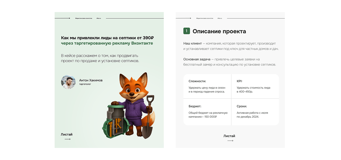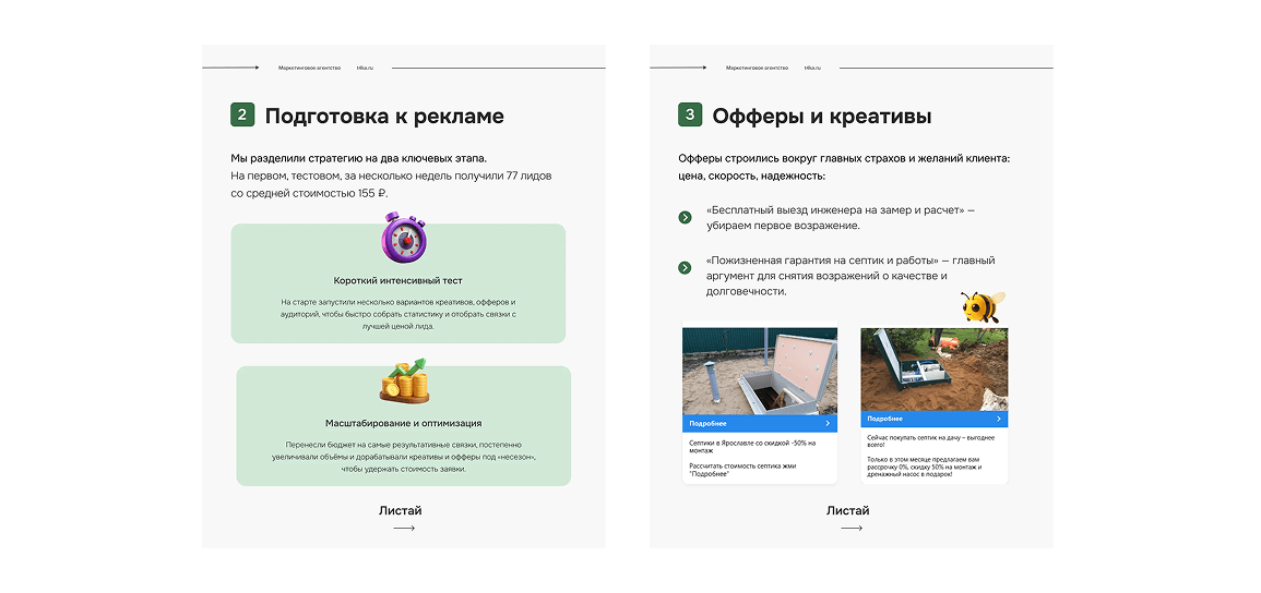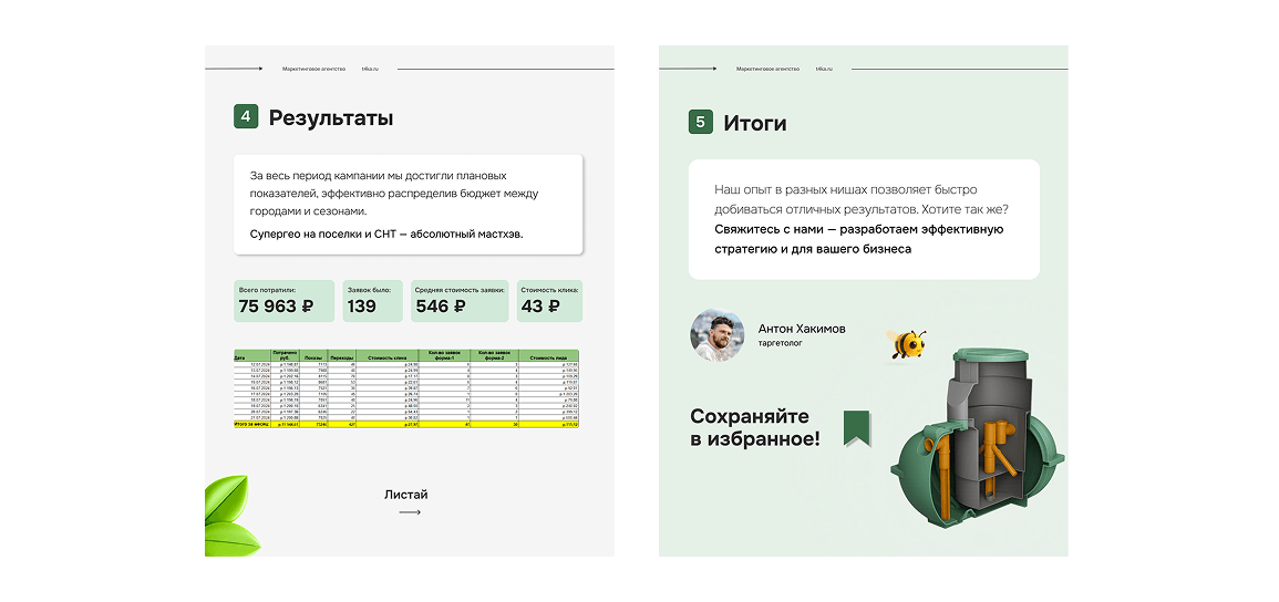 «Этот кейс наглядно показывает, как грамотно настроенная таргетированная реклама может принести стабильный поток целевых лидов на установку септиков при разумных вложениях в бюджет. Опыт работы с такой нишей и понимание специфики спроса позволяют нам привлекать обращение от реальных заказчиков, готовых к установке. Свяжитесь с нами, чтобы обсудить ваши задачи и выстроить эффективную стратегию таргета под установку септиков»
