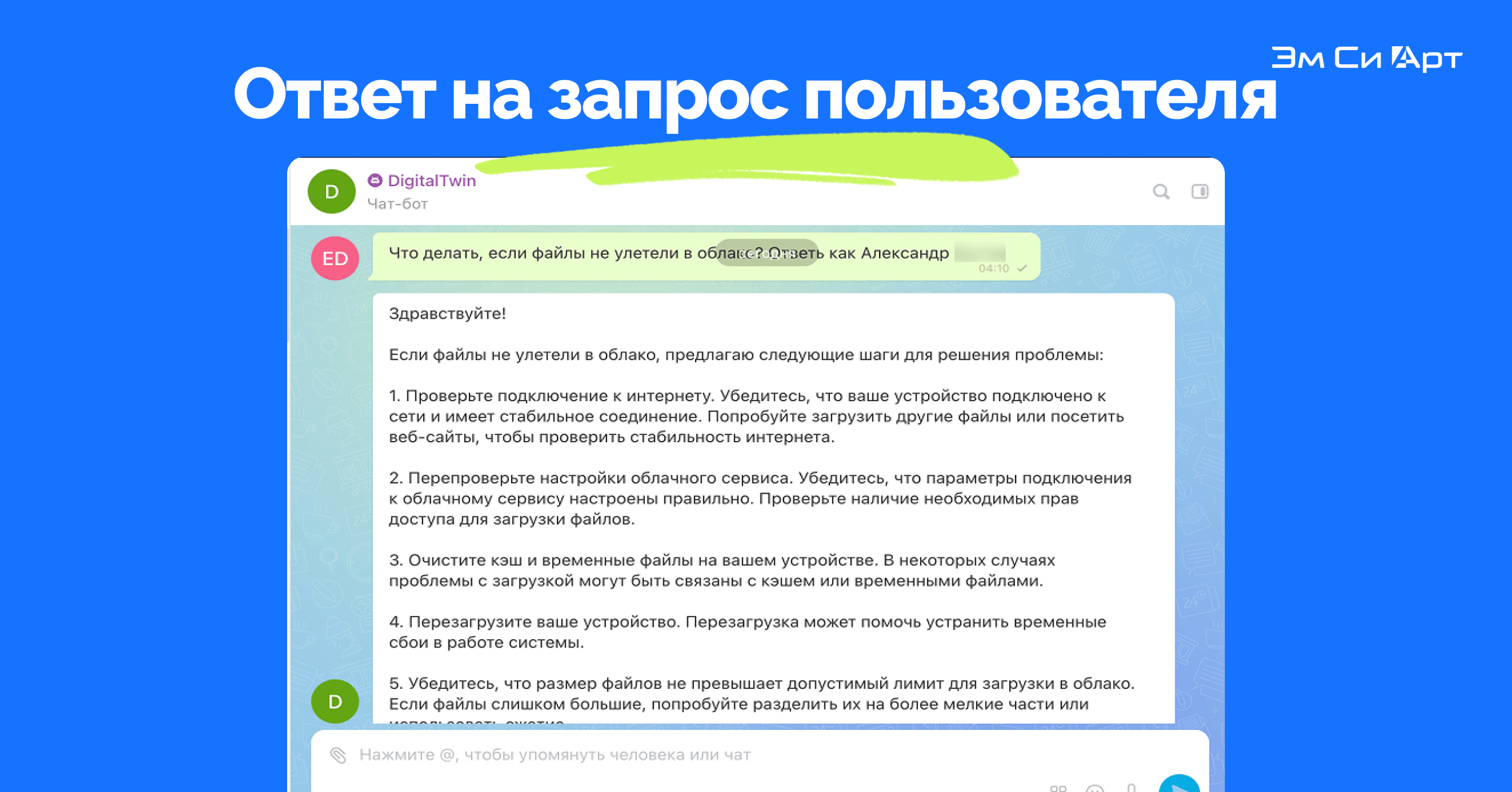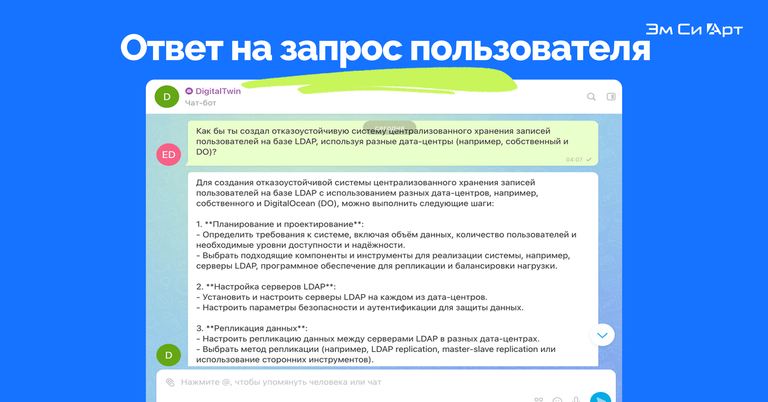 Мы превратили цифровой след сотрудников в их главный актив. Теперь, когда ключевой специалист уходит в отпуск или покидает компанию, его уникальный опыт, стиль работы и подход к решению задач не уходят вместе с ним. Они сохраняются в его «цифровом двойнике».